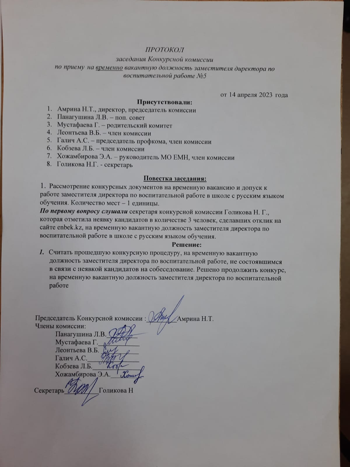 14 сәуір 2023 Протокол заседания Конкурсной комиссии по приему на временно вакантную должность заместителя директора по воспитательной работе №5