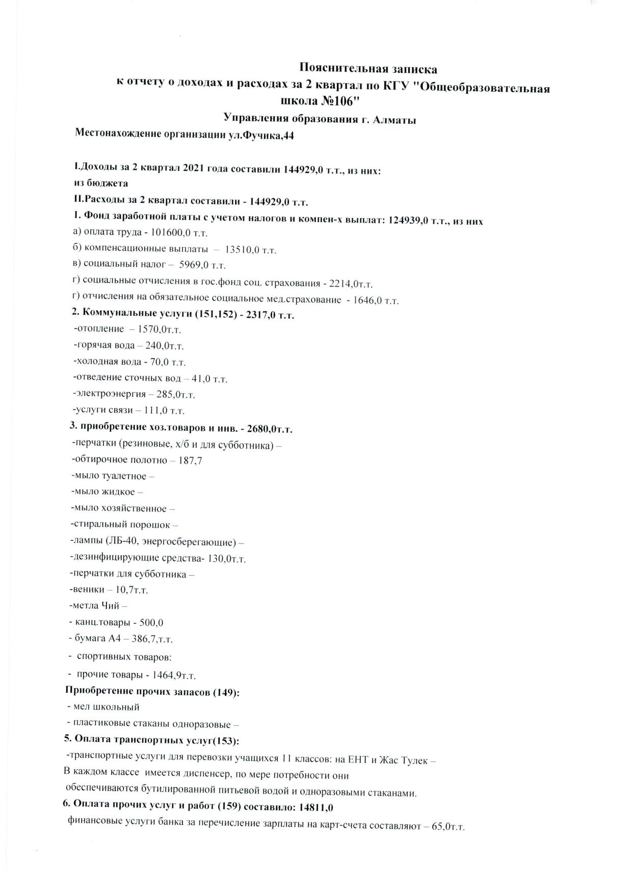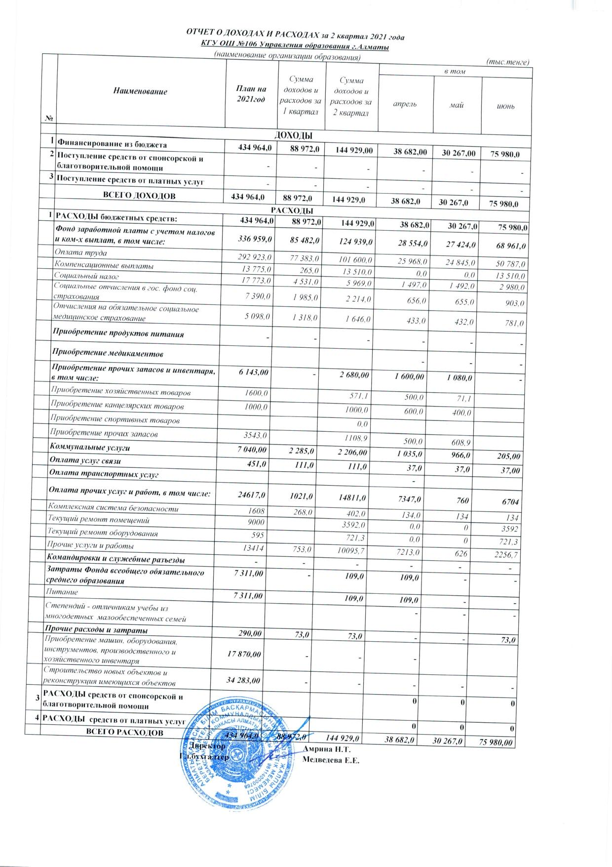 07 шілде 2021 Алматы қаласы Білім басқармасының № 106 ЖББМ КММ 2021 жылғы 2 тоқсандағы кірістер мен шығыстар есебі/ОТЧЕТ О ДОХОДАХ И РАСХОДАХ за 2 квартал 2021 года КГУ ОШ № 106 Управления образования г. Алматы
