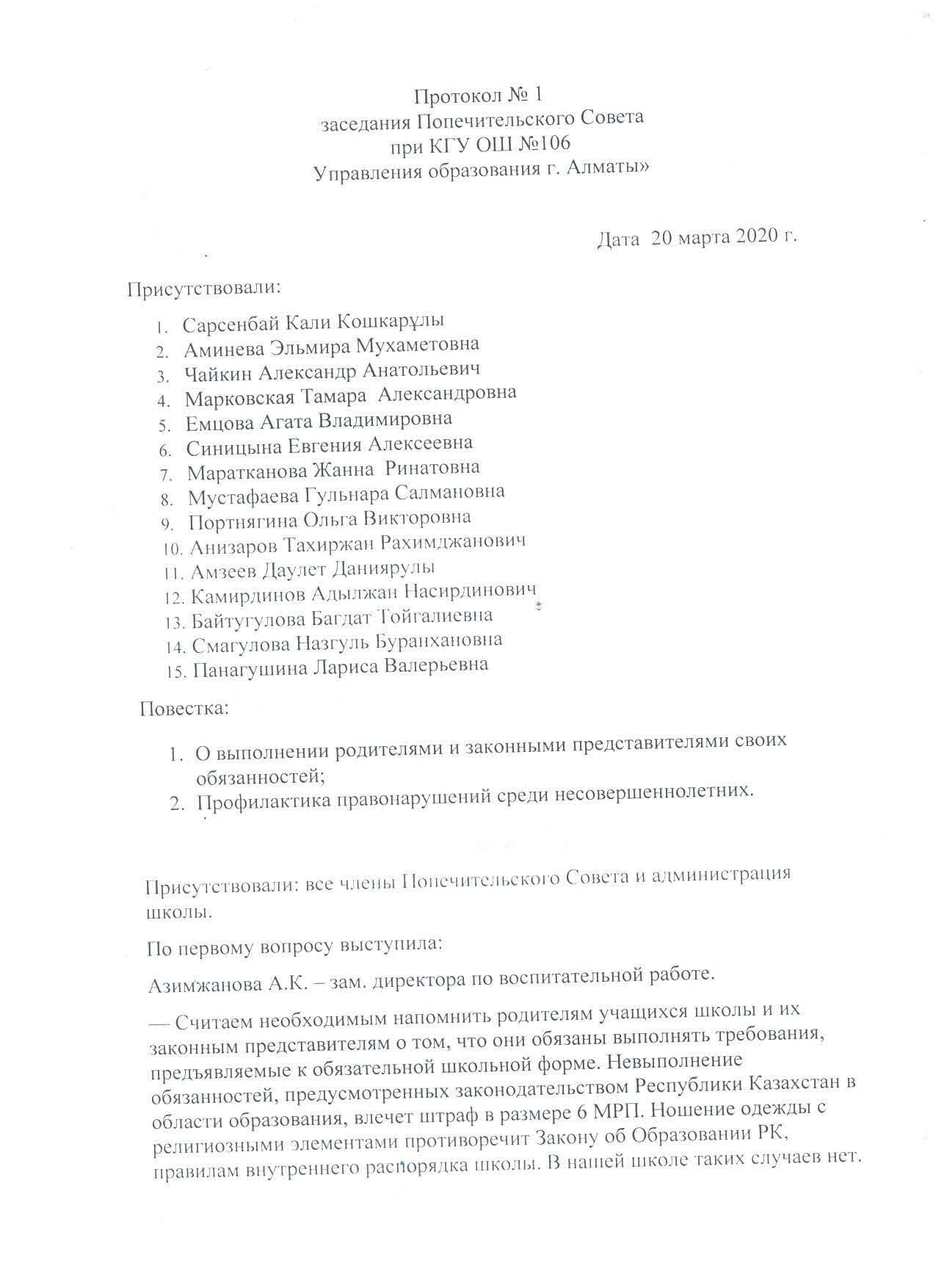 21 наурыз 2020 20.03.2020 ж қамқоршылық кеңес отырысының №1 хаттамасы/ Протокол заседания попечительского совета№1 от 20.03.2020