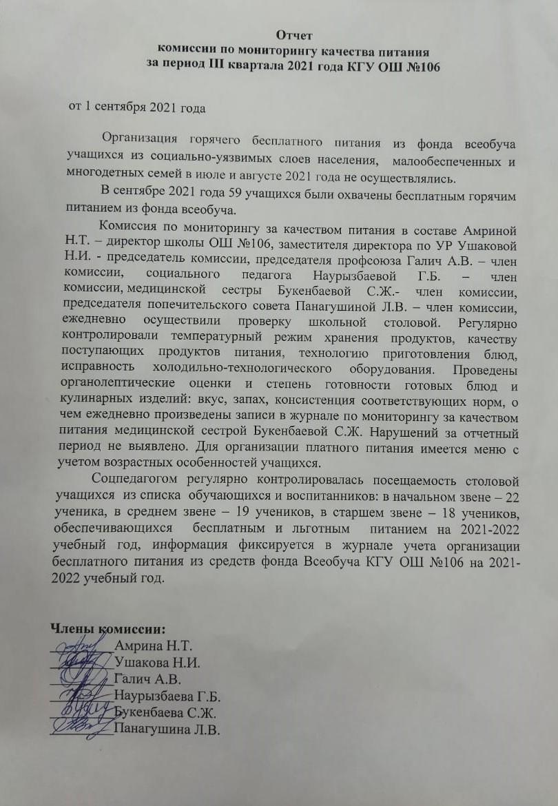 01 қазан 2021 2021 жылғы III тоқсан кезеңіндегі тамақтану сапасының мониторингі жөніндегі комиссияның есебі № 106 ЖББМ КММ/ Отчет комиссии по мониторингу качества питания за период III квартала 2021 года КГУ ОШ № 106