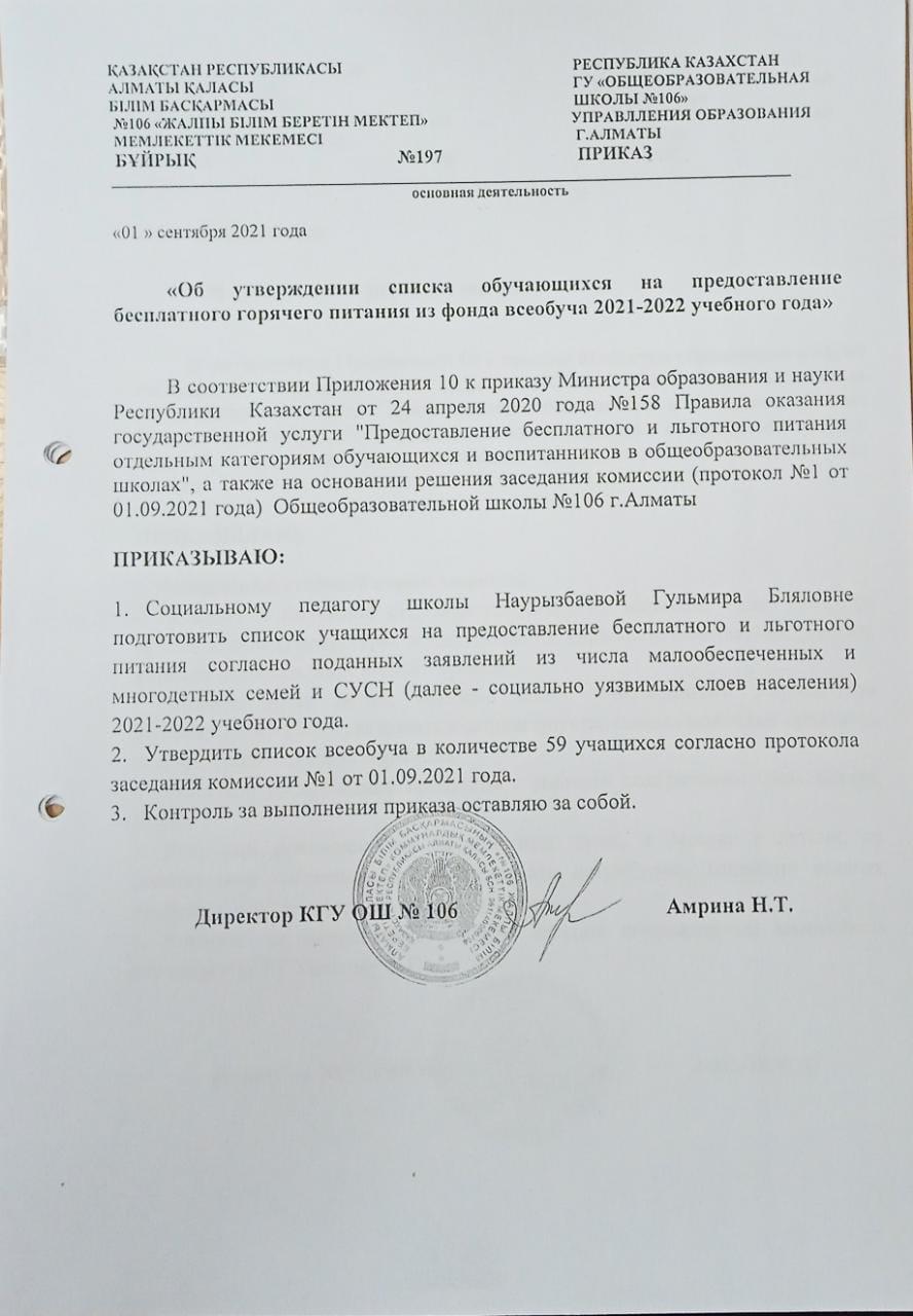 КГУ "Общеобразовательная школа №106"Управления образования города Алматы » Тамақтандыру » "2021-2022 оқу жылының жалпыға бірдей білім беру қорынан тегін ыстық тамақ беруге білім алушылардың тізімін бекіту туралы"/ "Об утверждении списка обучающихся на предоставление бесплатного горячего питания из фонда всеобуча 2021-2022 учебного года"