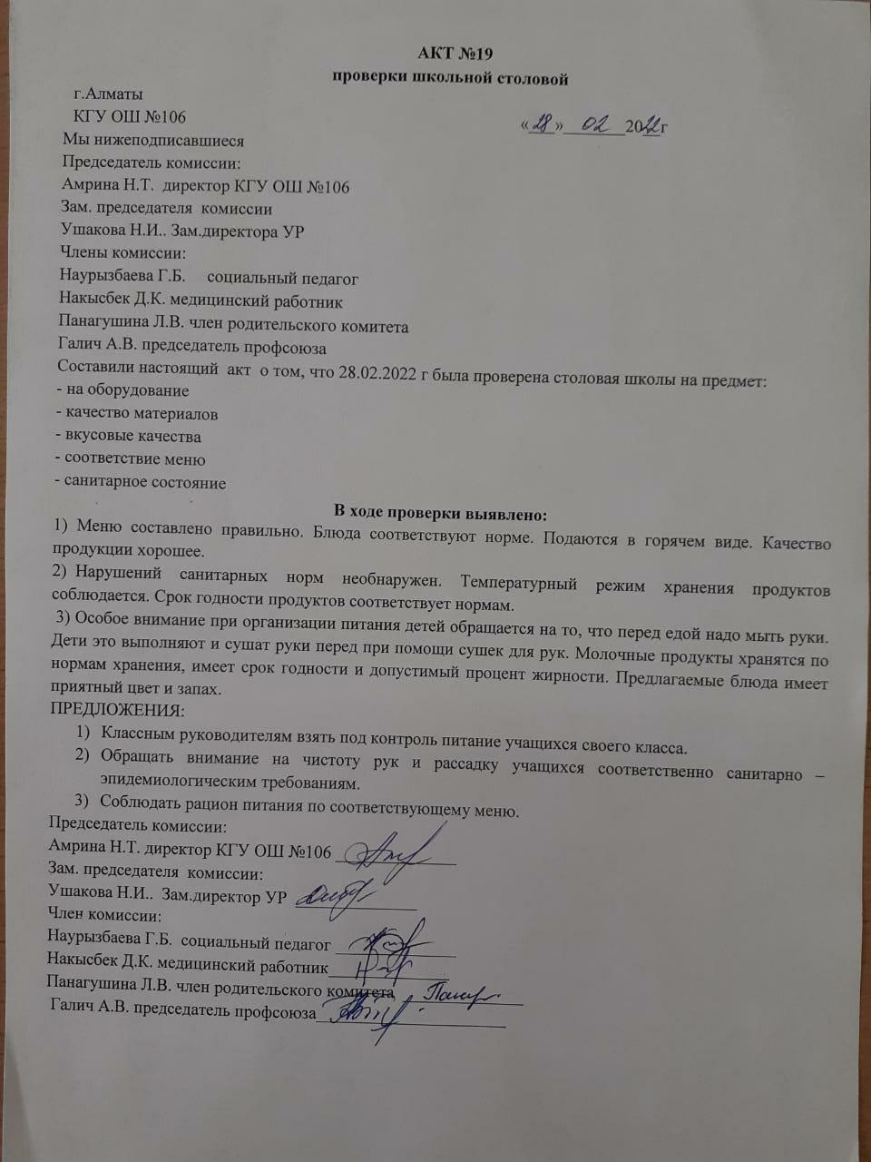 Бақылау комиссиясының мектеп асханасын тексеру туралы No5 АКТ/АКТ №5 проверки школьной столовой комиссии по мониторингу