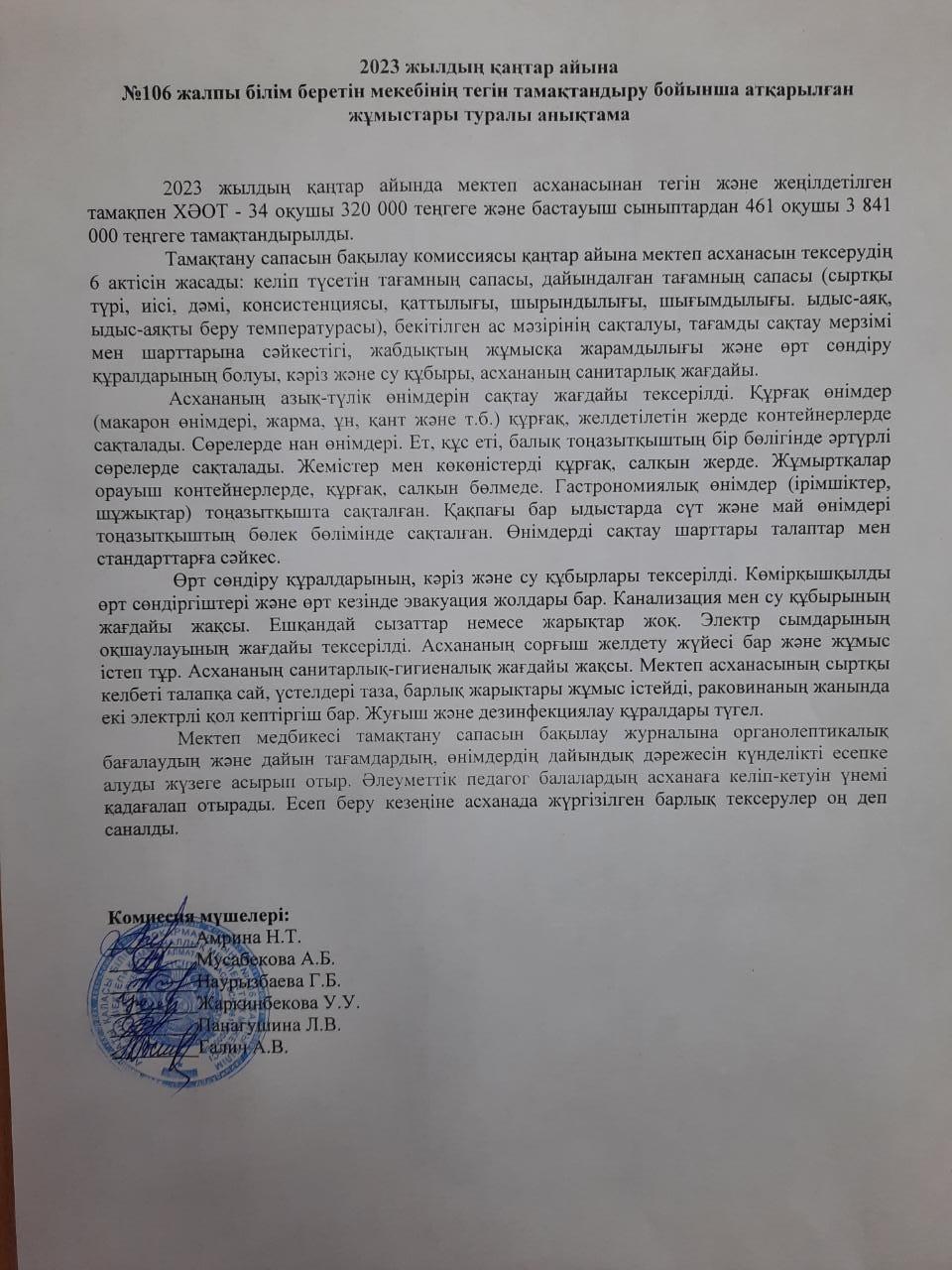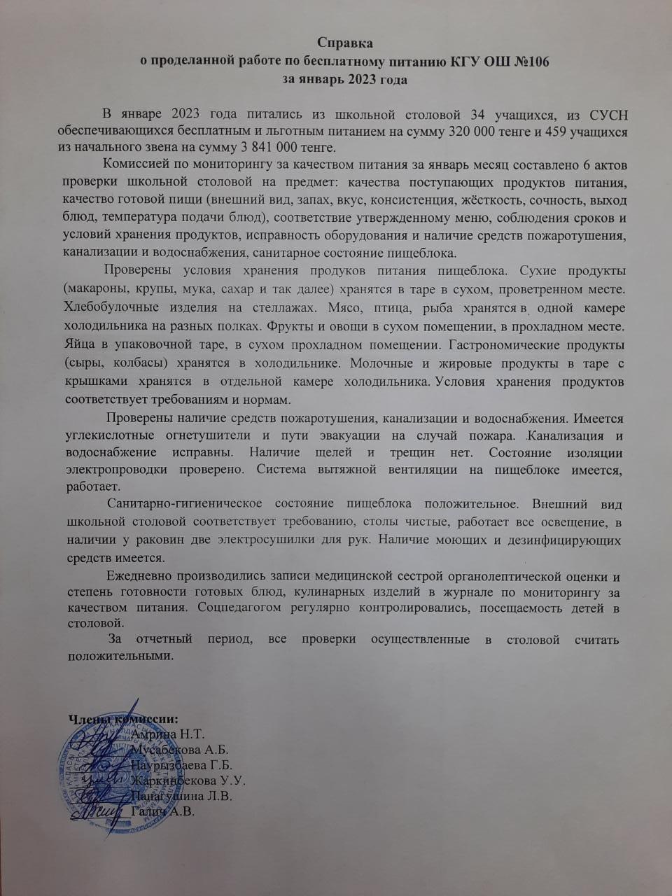 31 қаңтар 2023 2023 жылдың қаңтар айына №106 жалпы білім беретін мектебінің тегін тамақтандыру бойынша атқарылған жұмыстары туралы анықтама/ Справка о проделанной работе по бесплатному питанию КГУ ОШ №106 за январь 2023 года