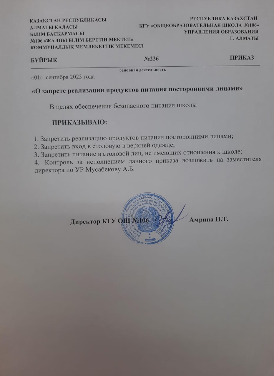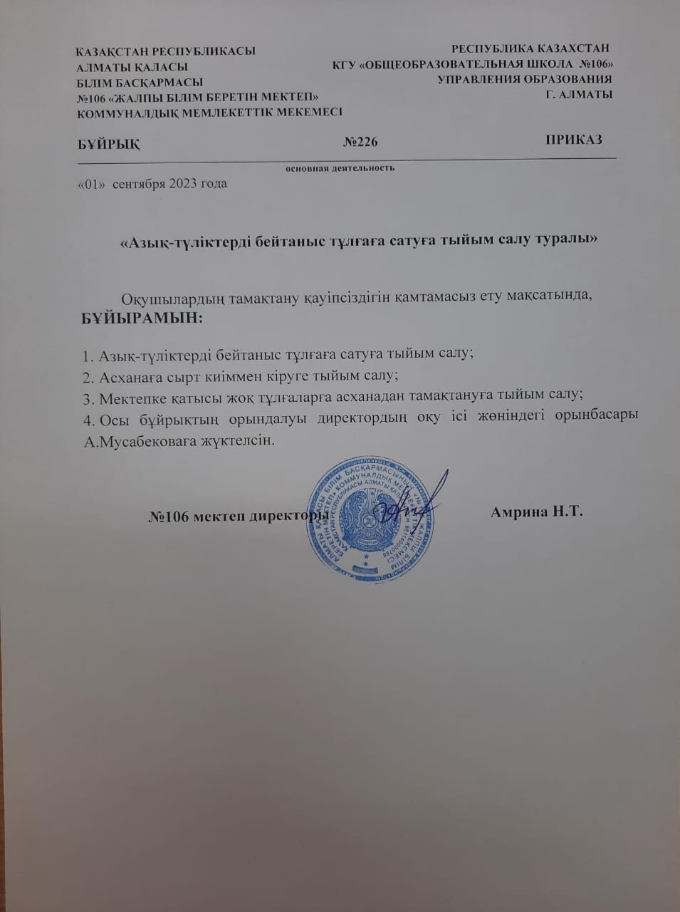 01 қыркүйек 2023 «Тамақ өнімдерін бөтен тұлғалардың сатуына тыйым салу туралы»/"О запрете реализации продуктов питания посторонними лицами"