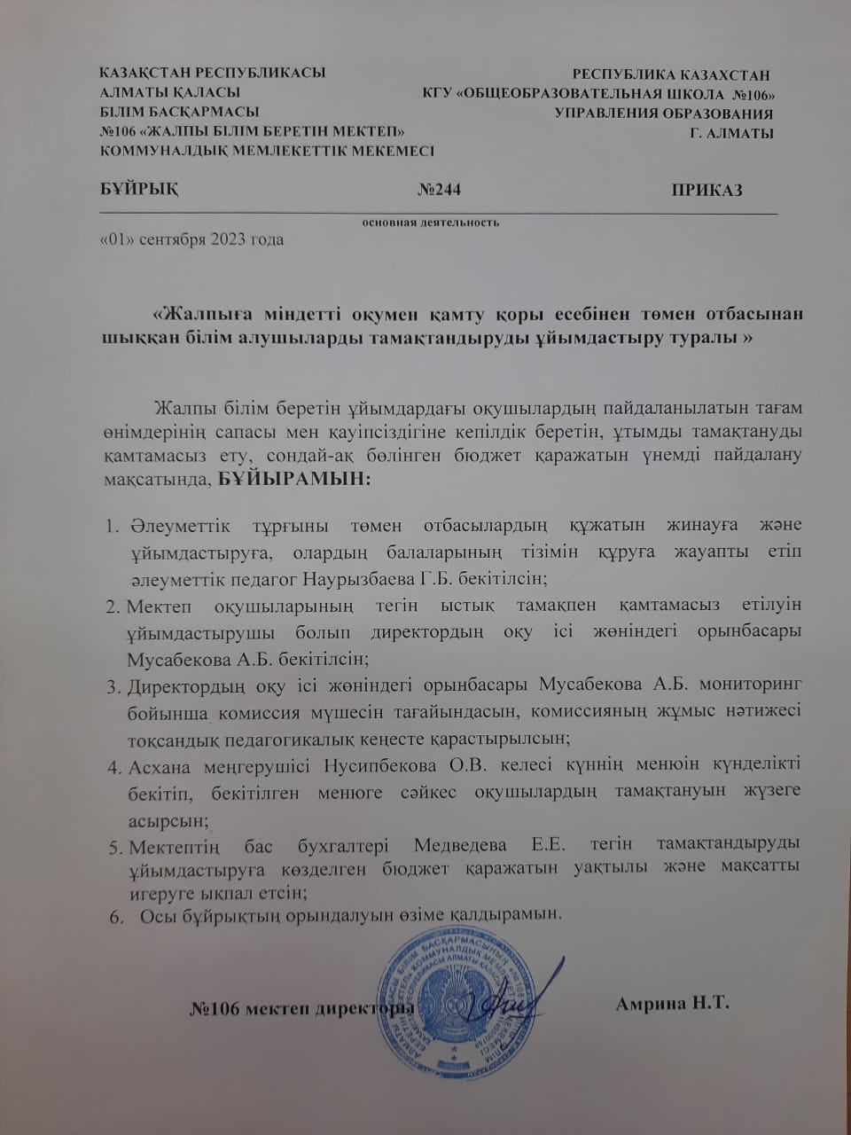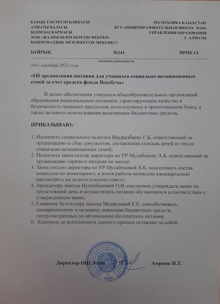 01 қыркүйек 2023 "Жалпыға міндетті оқумен қамту қоры есебінен төмен отбасынан шыққан білім алушыларды тамақтандыруды ұйымдастыру туралы"