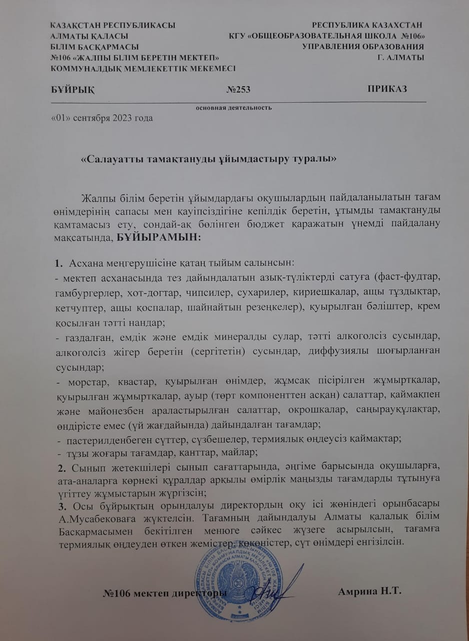 "Дұрыс тамақтануды ұйымдастыру туралы"/ "Об организации здорового питания"