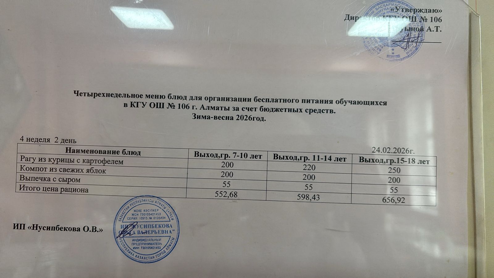 Бюджет қаражаты есебінен орта білім беру ұйымдарында білім алушылардың тегін тамақтануы/Четырехнедельное меню блюд для организации бесплатного питания обучающихся в организациях среднего образования за счет бюджетных средств зима 2025