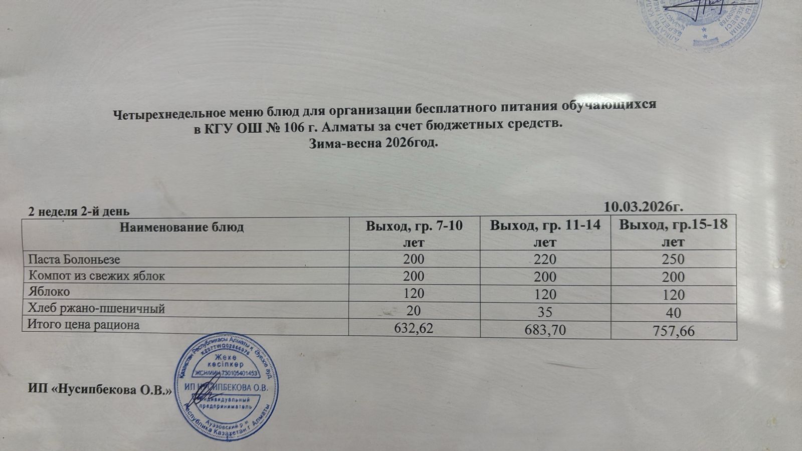 Бюджет қаражаты есебінен орта білім беру ұйымдарында білім алушылардың тегін тамақтануы/Четырехнедельное меню блюд для организации бесплатного питания обучающихся в организациях среднего образования за счет бюджетных средств зима 2025