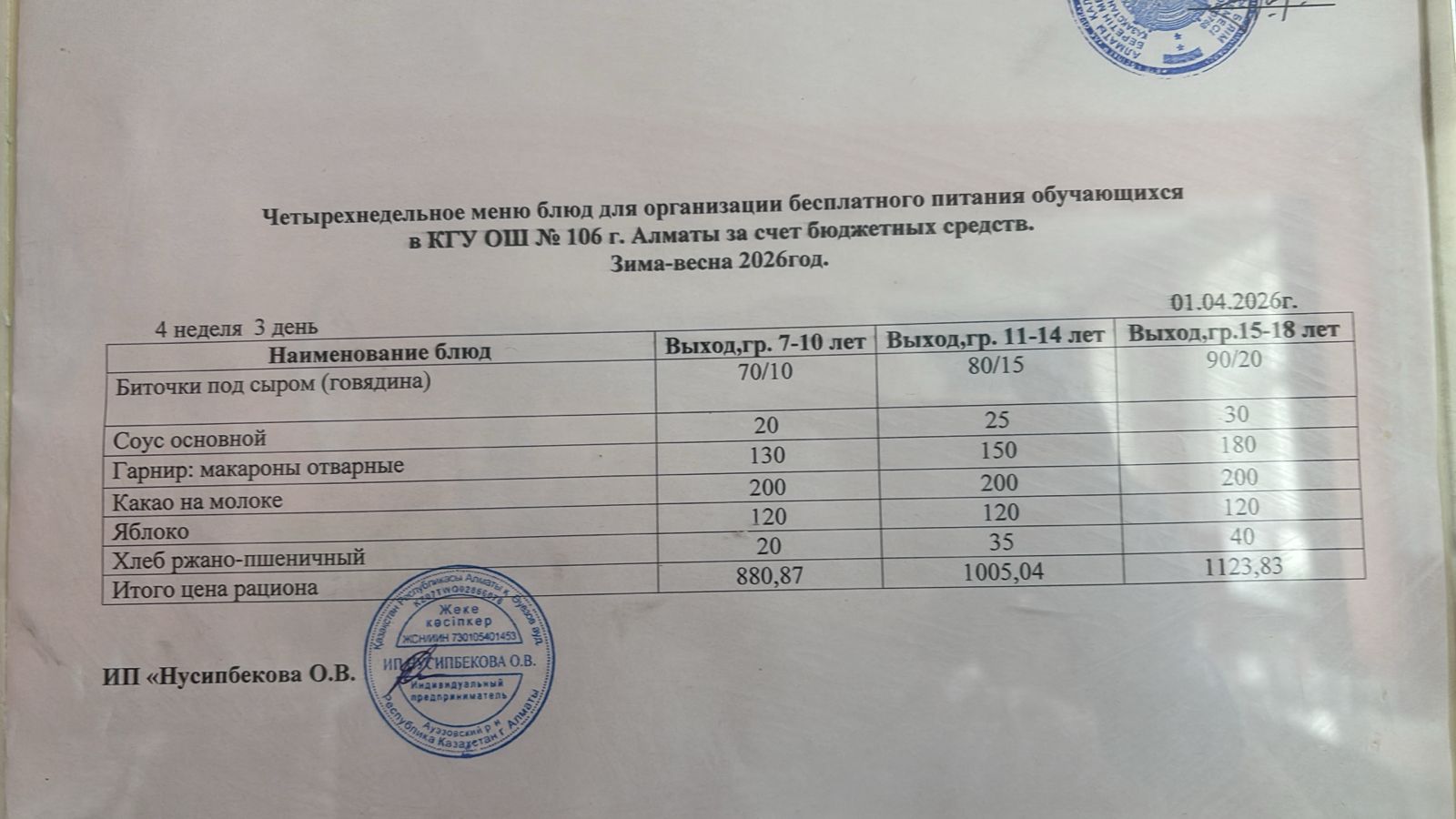 Бюджет қаражаты есебінен орта білім беру ұйымдарында білім алушылардың тегін тамақтануы/Четырехнедельное меню блюд для организации бесплатного питания обучающихся в организациях среднего образования за счет бюджетных средств зима 2025