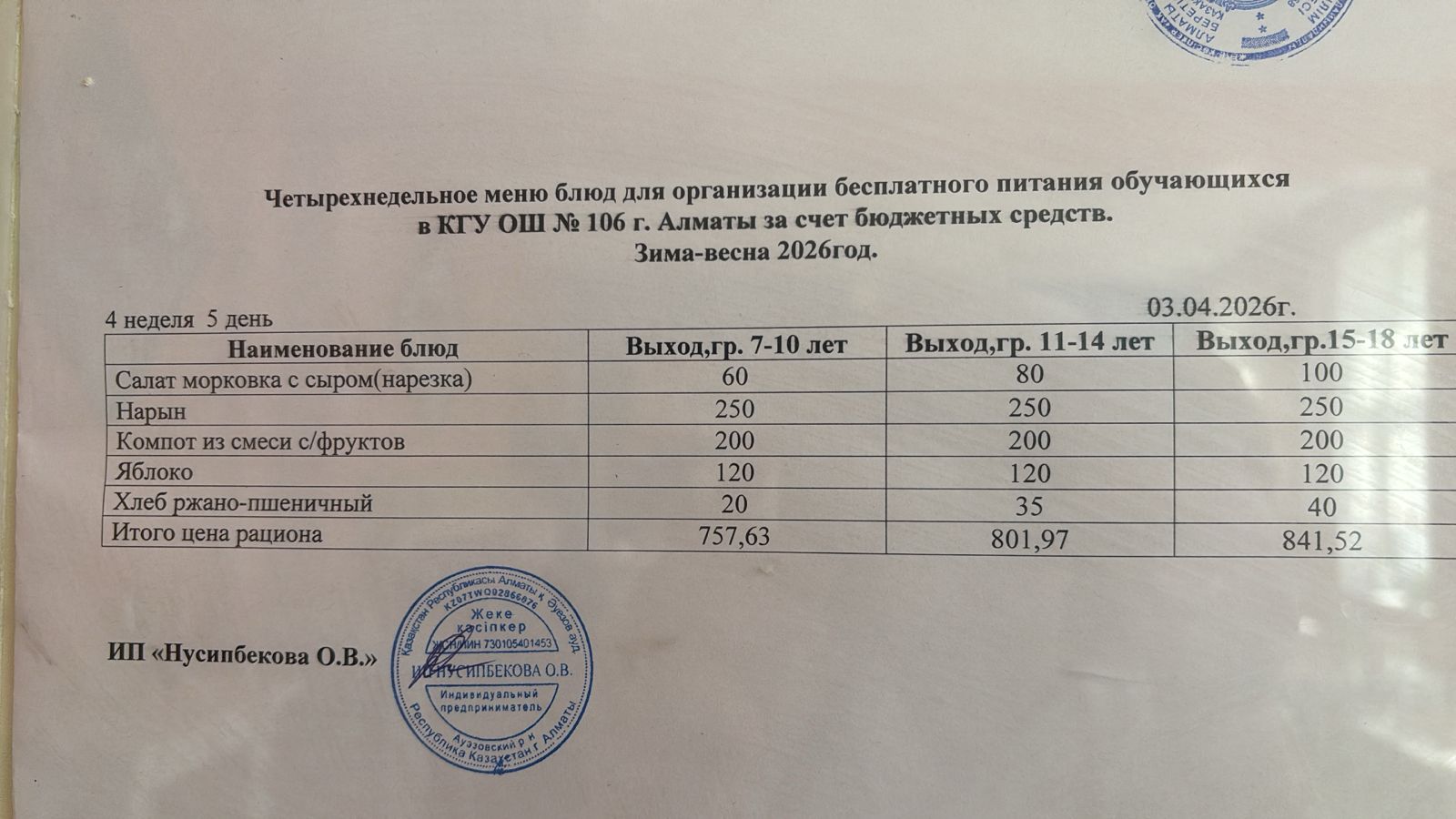 Бюджет қаражаты есебінен орта білім беру ұйымдарында білім алушылардың тегін тамақтануы/Четырехнедельное меню блюд для организации бесплатного питания обучающихся в организациях среднего образования за счет бюджетных средств зима 2025