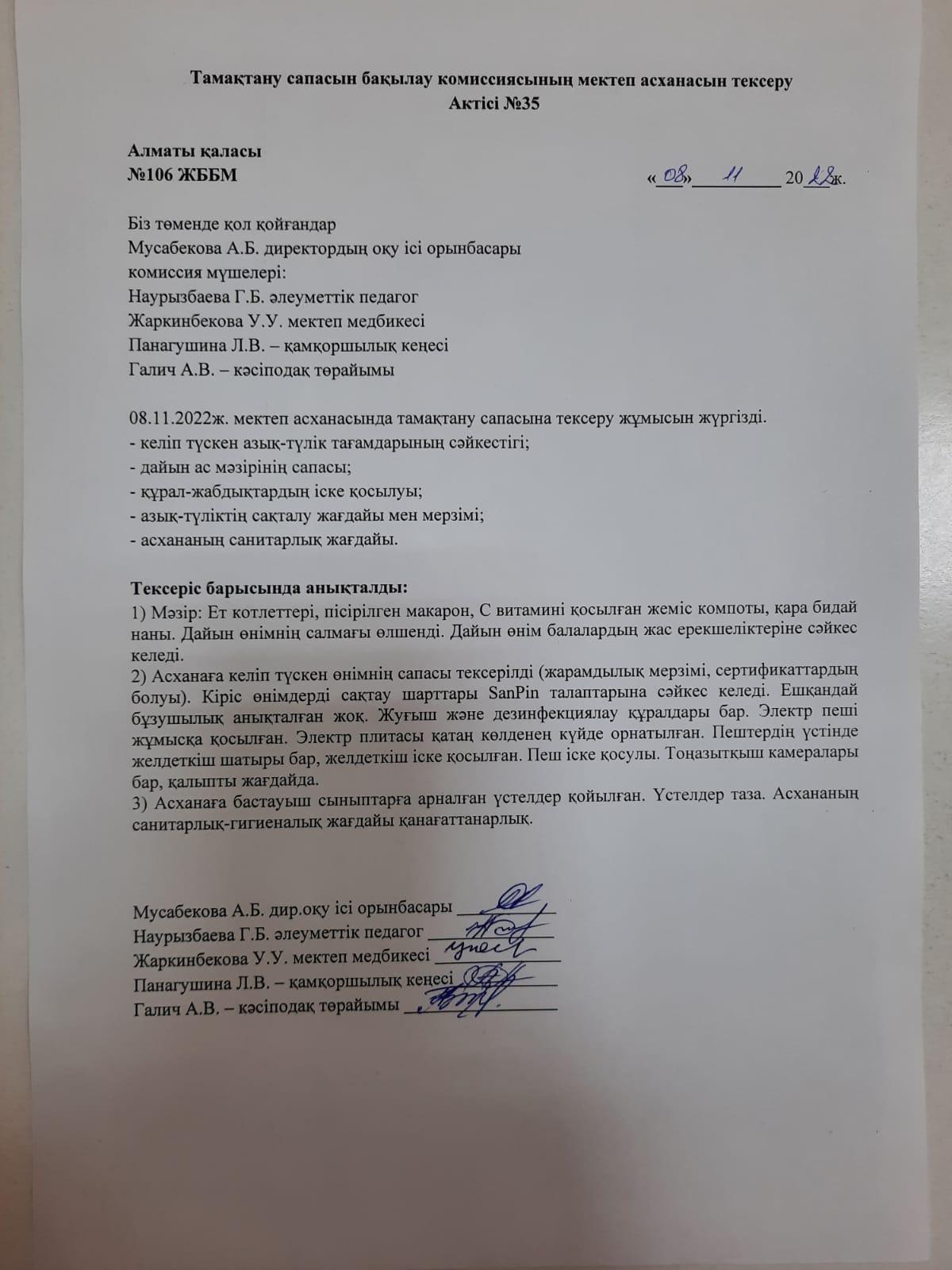 Тамақтану сапасын бақылау комиссиясының мектеп асханасын тексеру Актісі №35