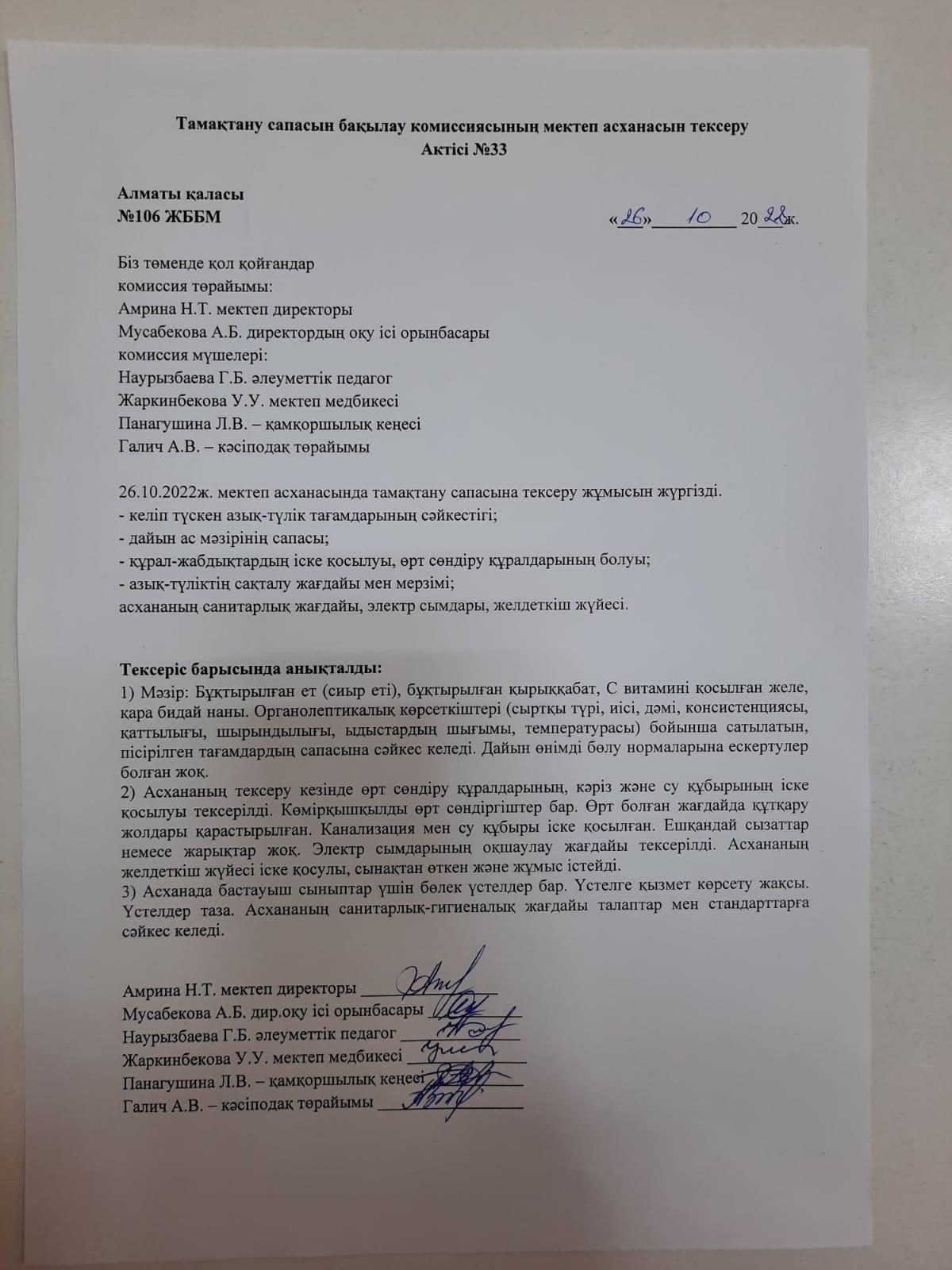 Тамақтану сапасын бақылау комиссиясының мектеп асханасын тексеру Актісі №33