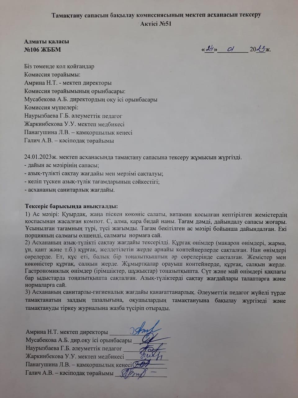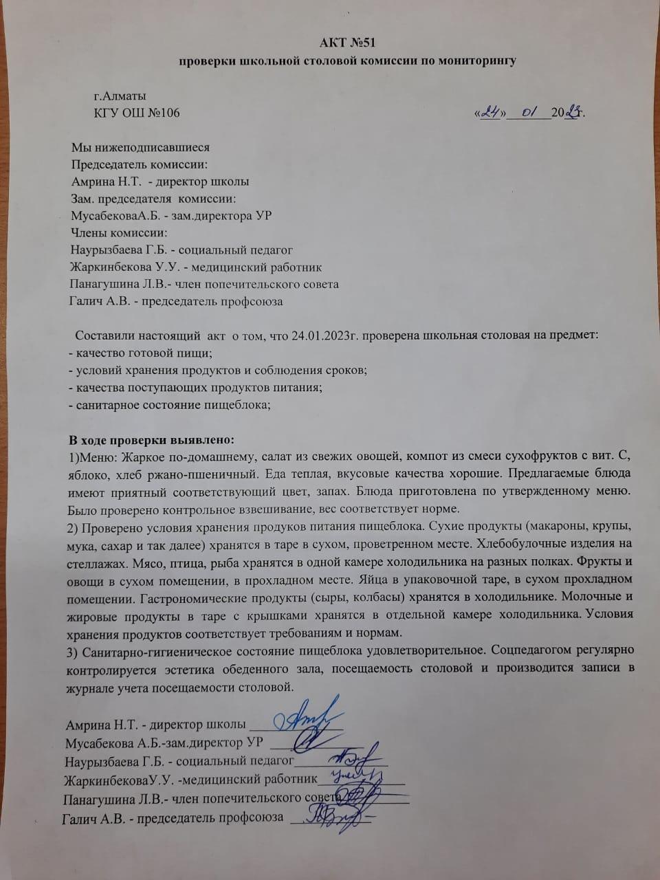 24 қаңтар 2023 Тамақтану сапасын бақылау комиссиясының мектеп асханасын тексеру Актісі №51\ АКТ №51 проверки школьной столовой комиссии по мониторингу