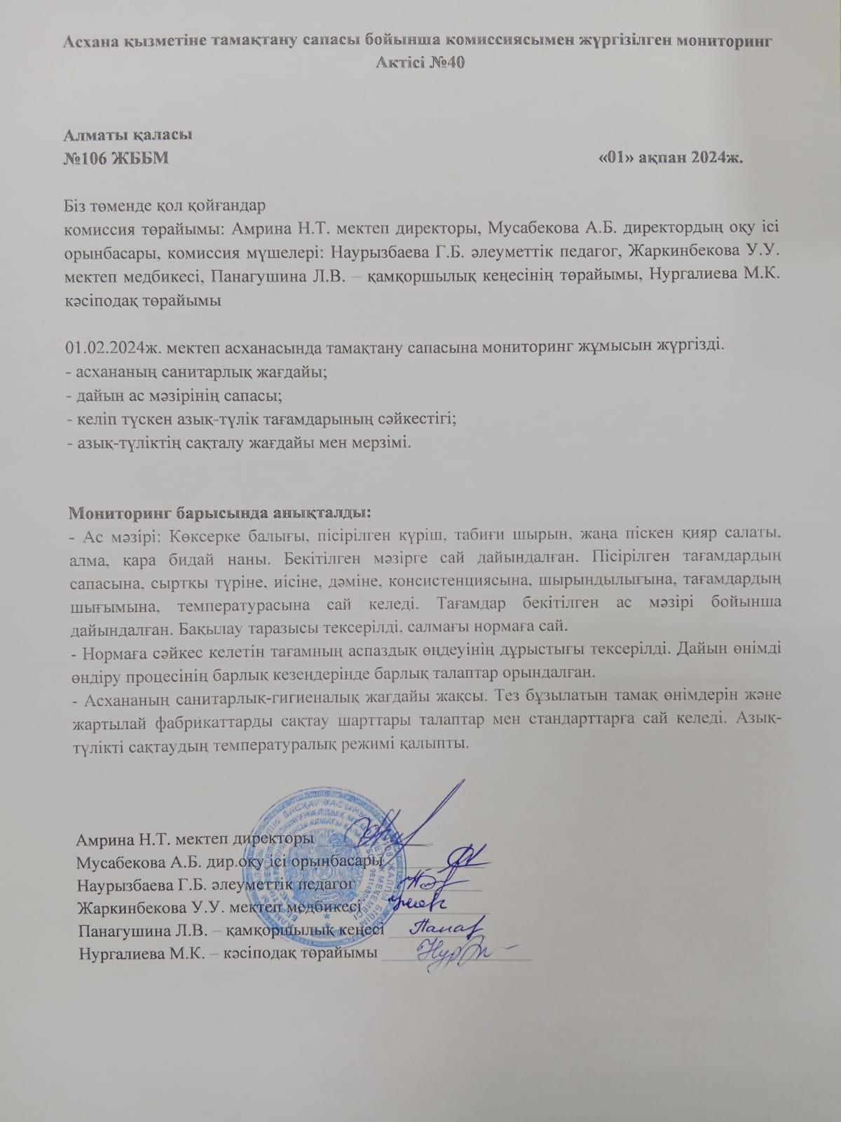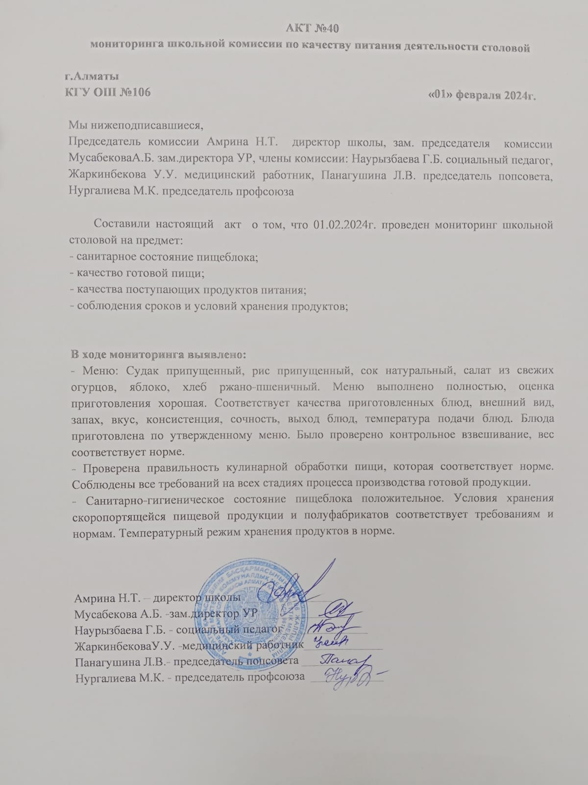 01 ақпан 2024 Асхана қызметіне тамақтану сапасы бойынша комиссиясымен жүргізілген мониторинг Актісі №40/АКТ №40 мониторинга школьной комиссии по качеству питания деятельности столовой