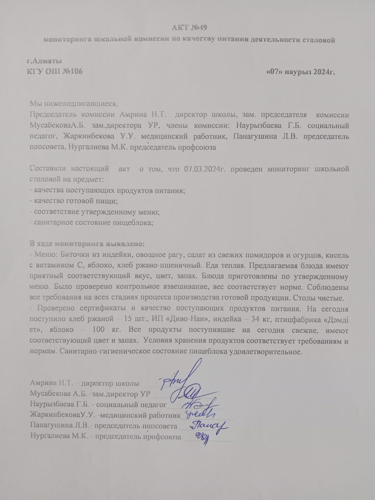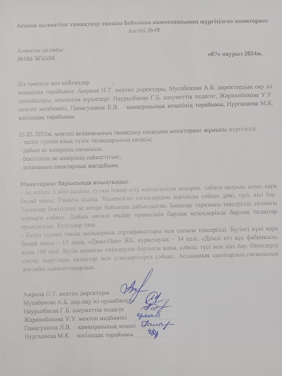 07 наурыз 2024 Асхана қызметіне тамақтану сапасы бойынша комиссиясымен жүргізілген мониторинг Актісі №49/АКТ № 49 мониторинга школьной комиссии по качеству питания деятельности столовой