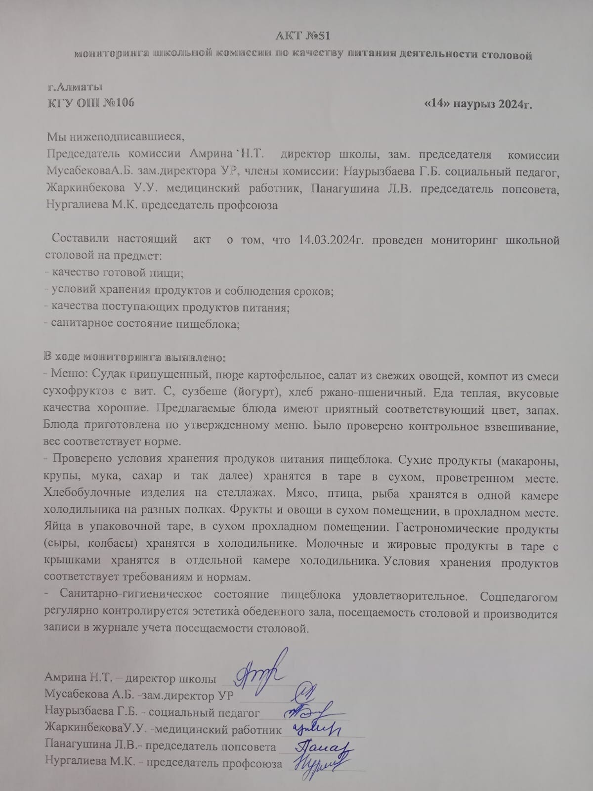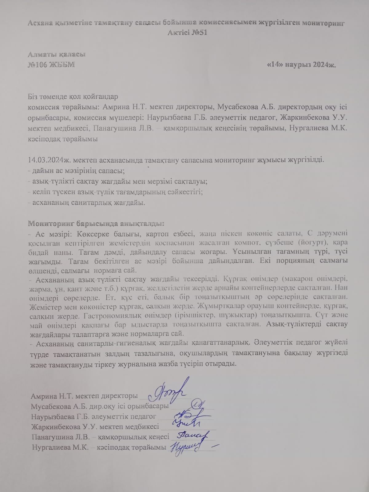 Бақылау комиссиясының мектеп асханасын тексеру туралы No5 АКТ/АКТ №5 проверки школьной столовой комиссии по мониторингу