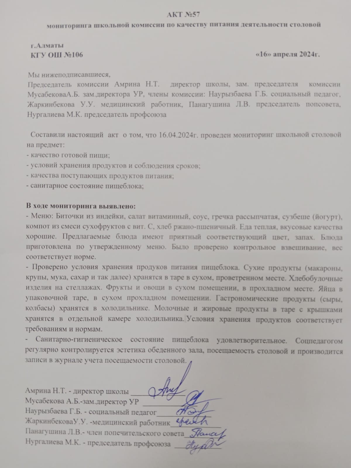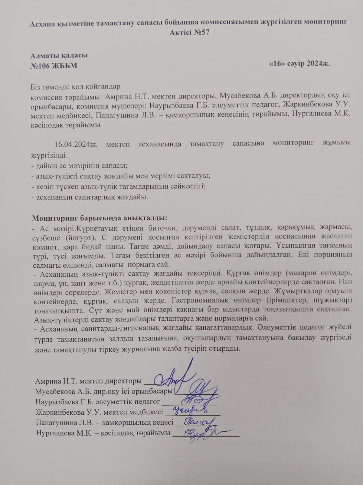 Бақылау комиссиясының мектеп асханасын тексеру туралы No5 АКТ/АКТ №5 проверки школьной столовой комиссии по мониторингу