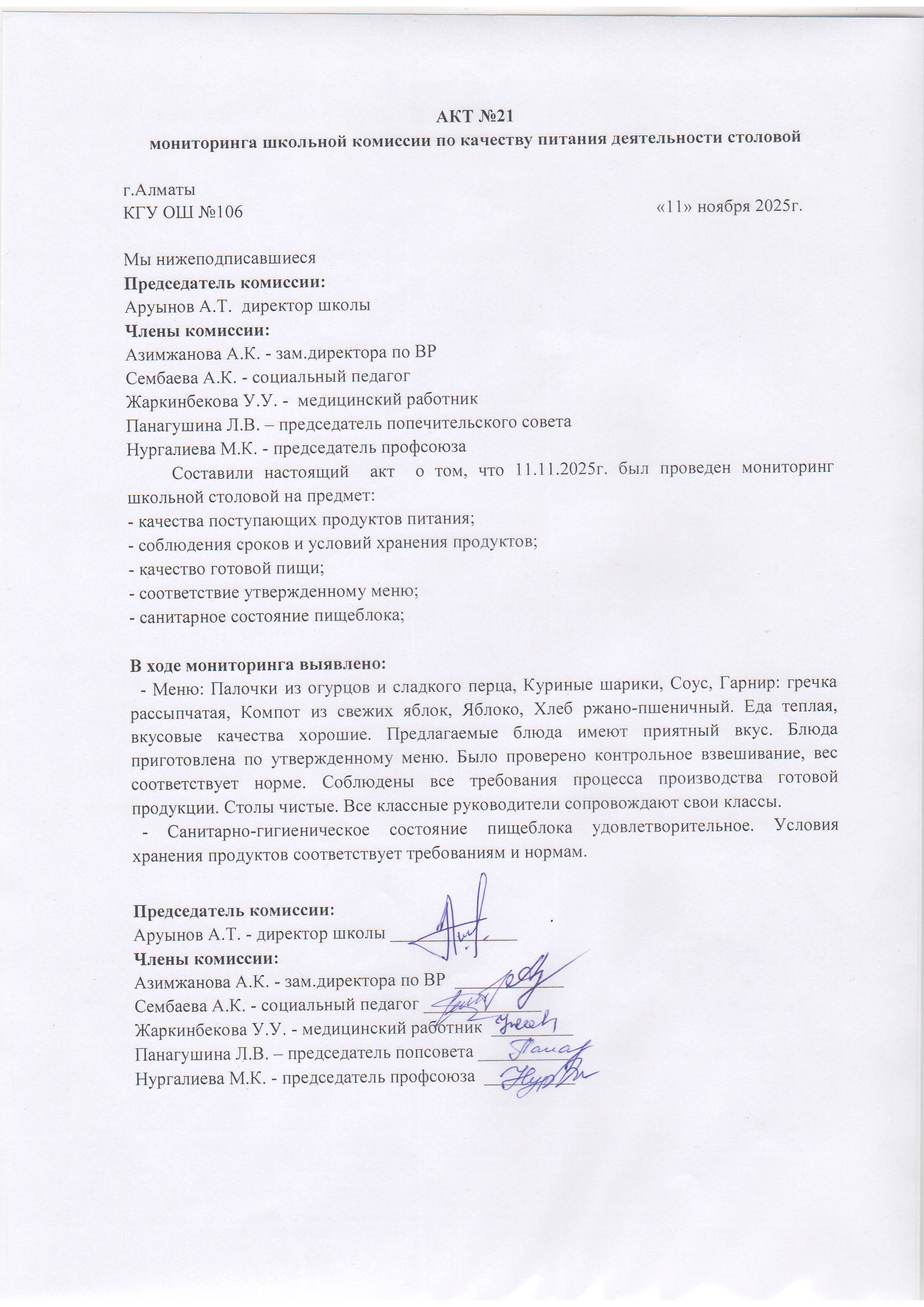 11 қараша 2025 Асхана қызметіне тамақтану сапасы бойынша комиссиямен жүргізілген мониторинг актісі/АКТ проверки школьной столовой комиссии по монитерингу