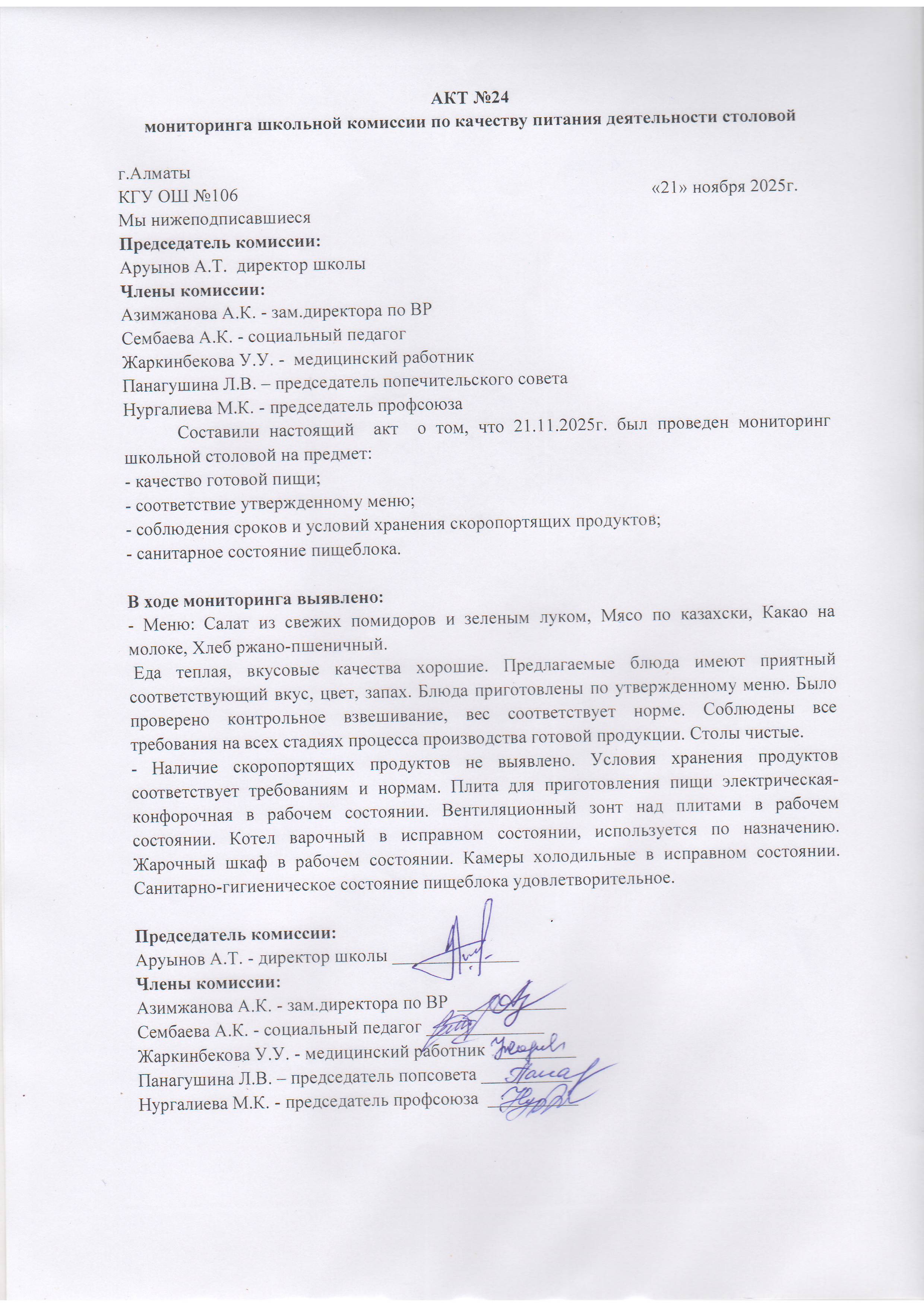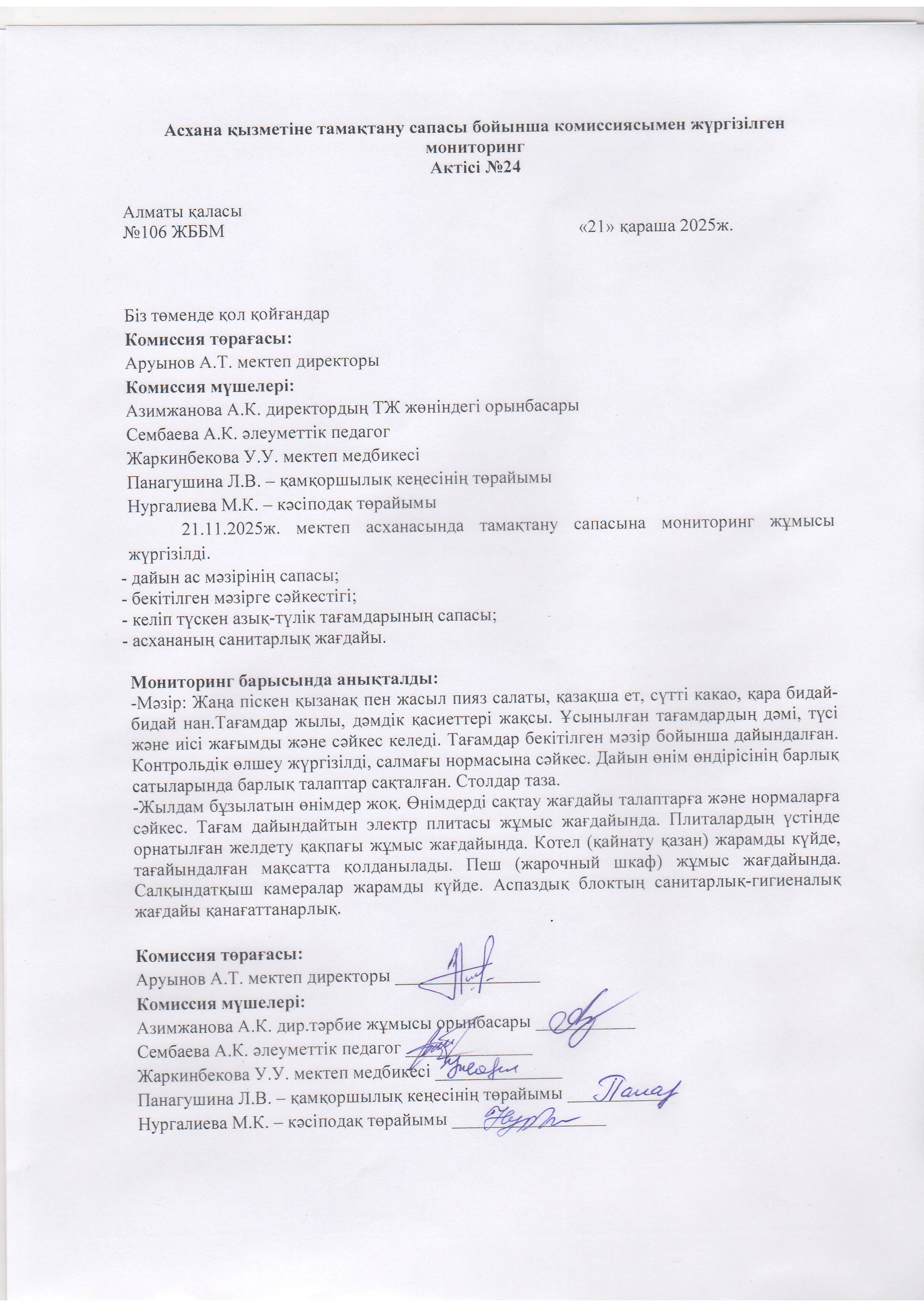 21 қараша 2025 Асхана қызметіне тамақтану сапасы бойынша комиссиямен жүргізілген мониторинг актісі/АКТ проверки школьной столовой комиссии по монитерингу