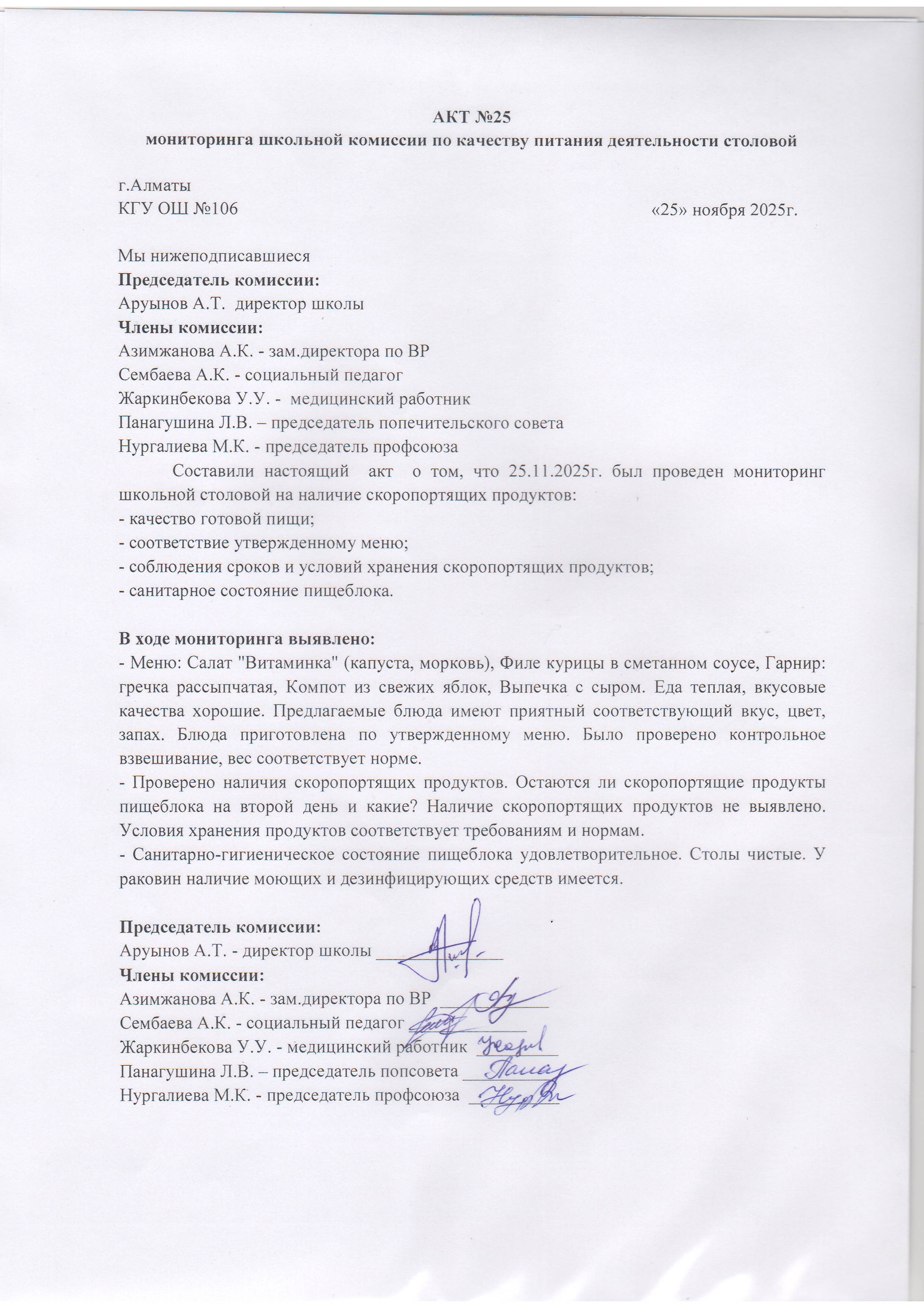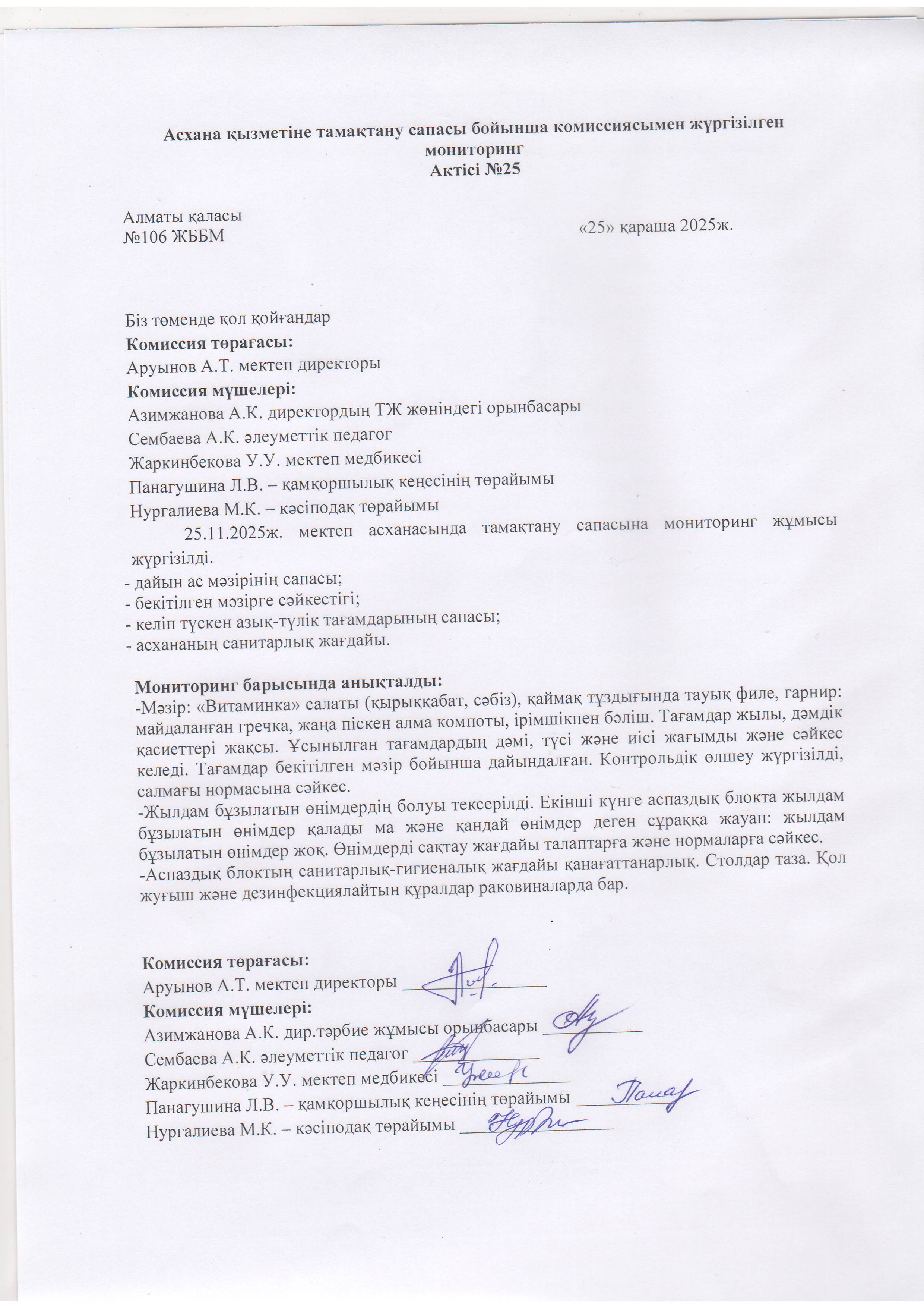 25 қараша 2025 Асхана қызметіне тамақтану сапасы бойынша комиссиямен жүргізілген мониторинг актісі/АКТ проверки школьной столовой комиссии по монитерингу