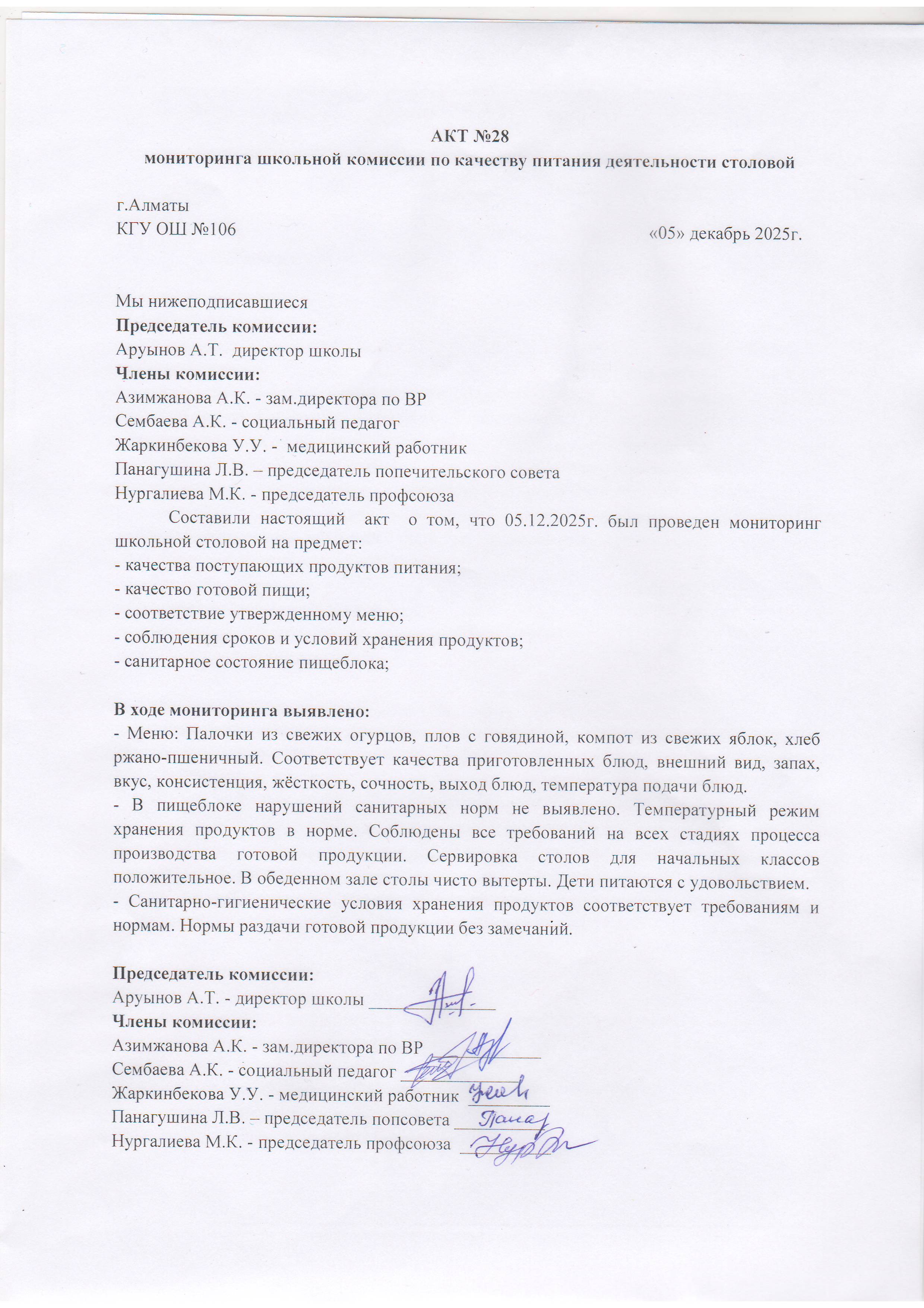 05 желтоқсан 2025 Асхана қызметіне тамақтану сапасы бойынша комиссиямен жүргізілген мониторинг актісі/АКТ проверки школьной столовой комиссии по монитерингу