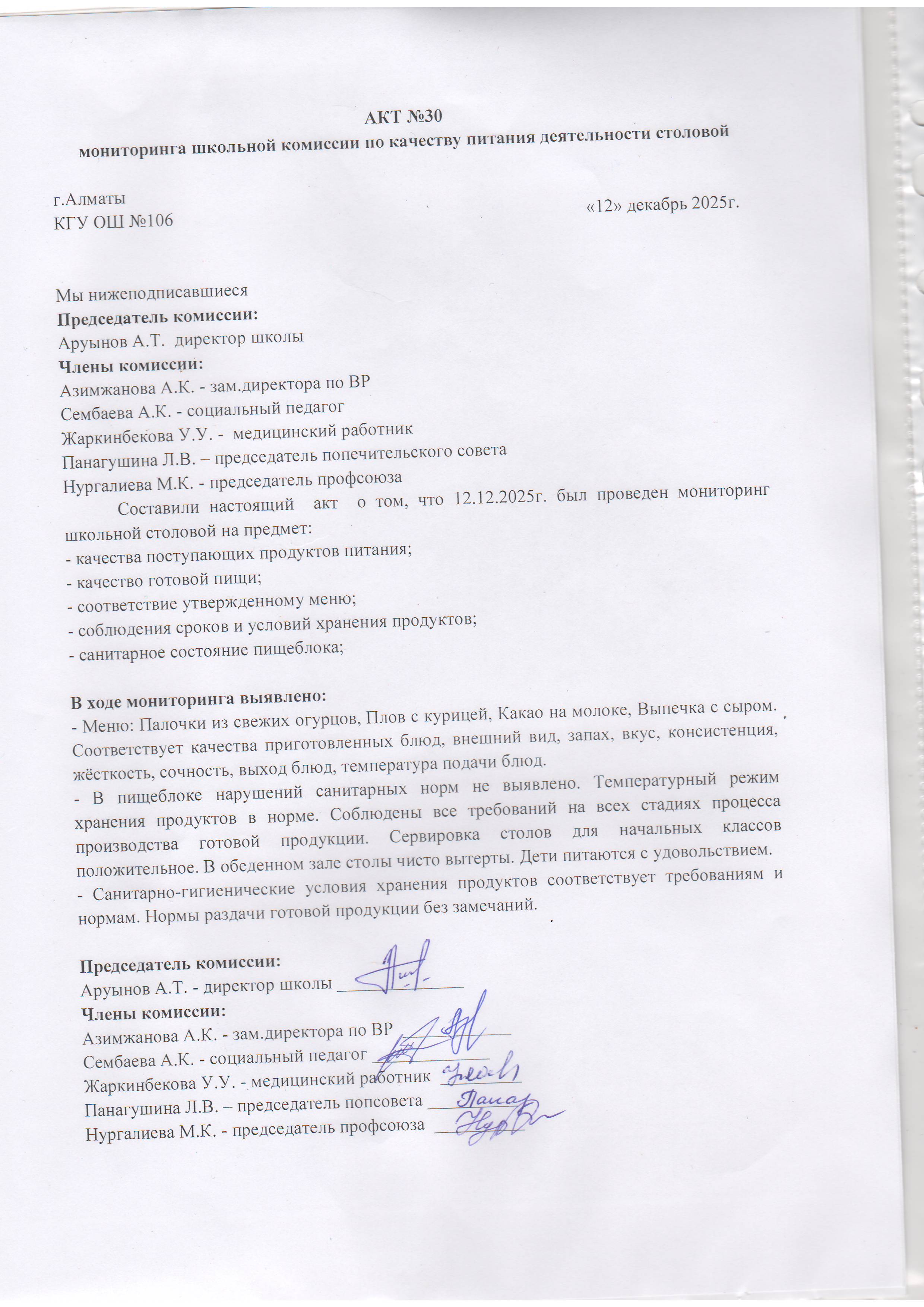 12 желтоқсан 2025 Асхана қызметіне тамақтану сапасы бойынша комиссиямен жүргізілген мониторинг актісі/АКТ проверки школьной столовой комиссии по монитерингу