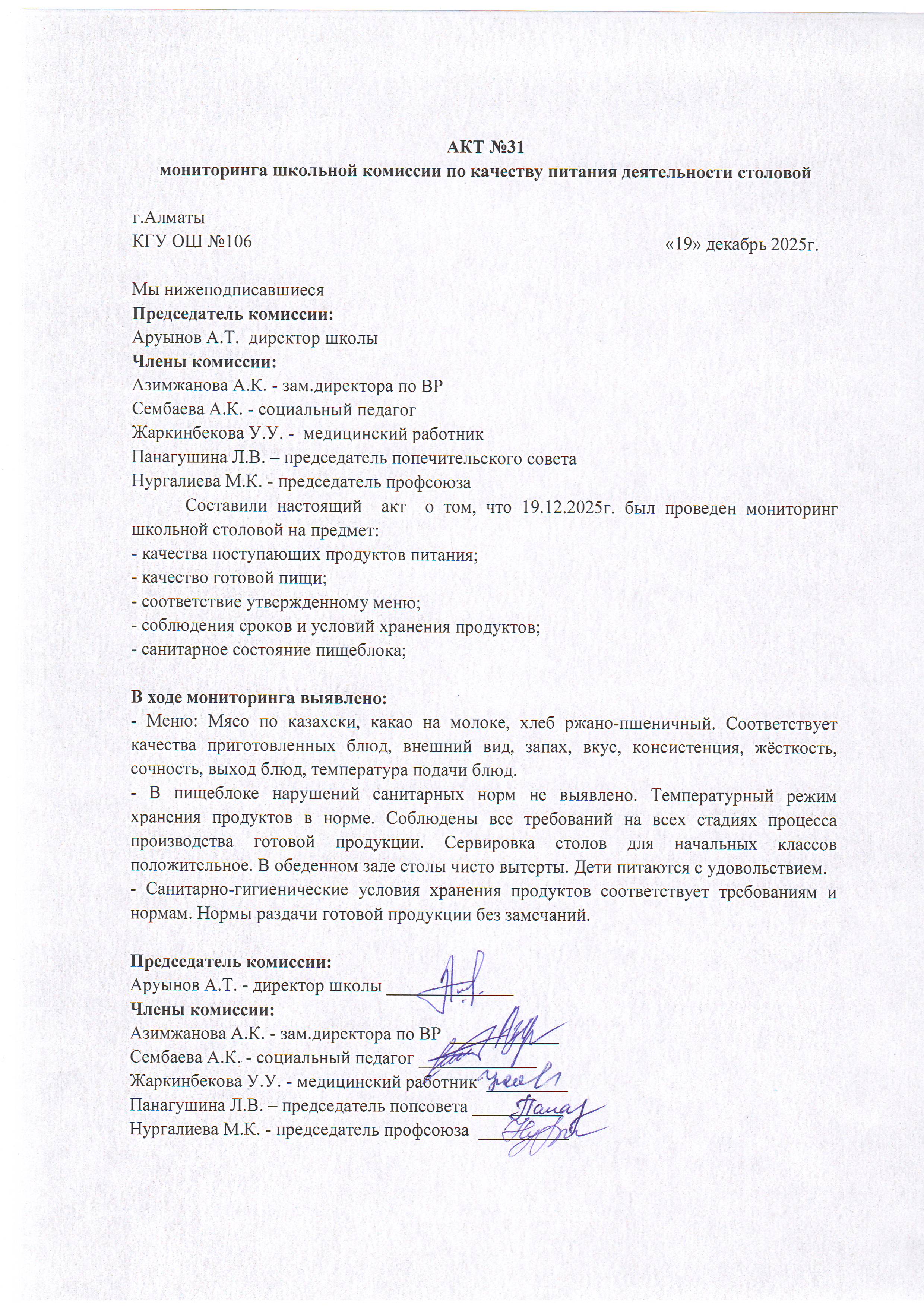 19 желтоқсан 2025 Асхана қызметіне тамақтану сапасы бойынша комиссиямен жүргізілген мониторинг актісі/АКТ проверки школьной столовой комиссии по монитерингу