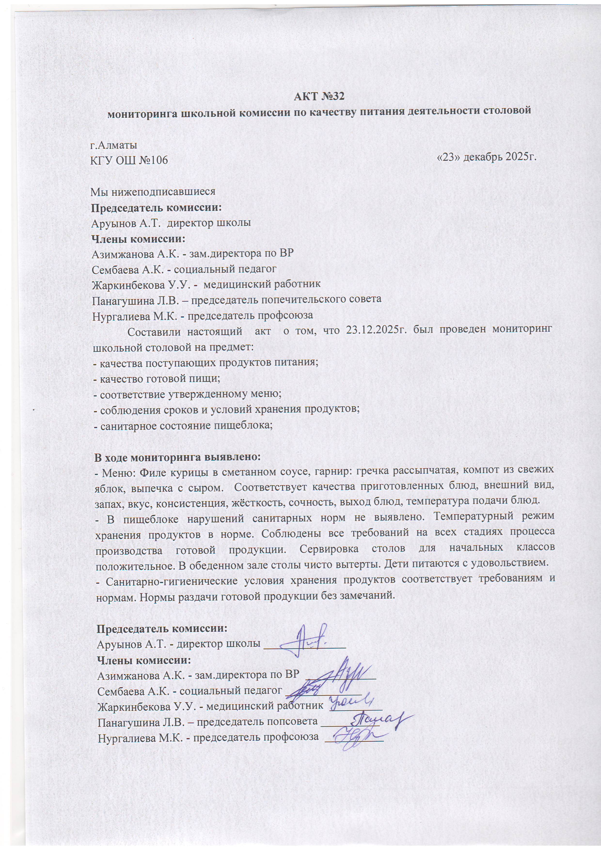 23 желтоқсан 2025 Асхана қызметіне тамақтану сапасы бойынша комиссиямен жүргізілген мониторинг актісі/АКТ проверки школьной столовой комиссии по монитерингу