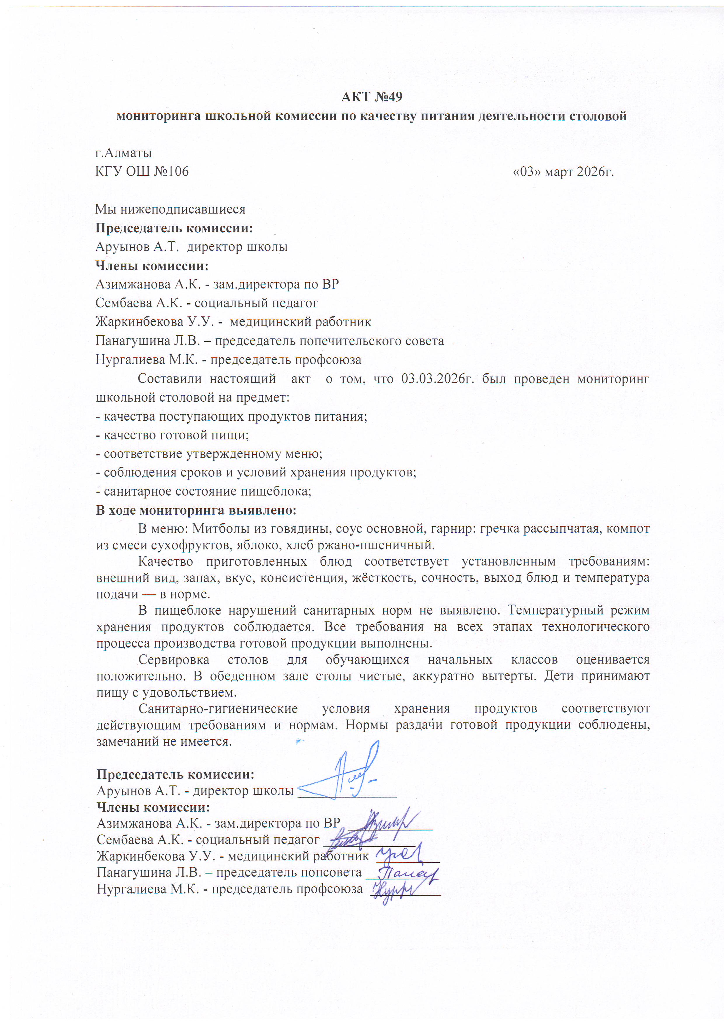 03 наурыз 2026 Асхана қызметіне тамақтану сапасы бойынша комиссиямен жүргізілген мониторинг актісі/АКТ проверки школьной столовой комиссии по монитерингу