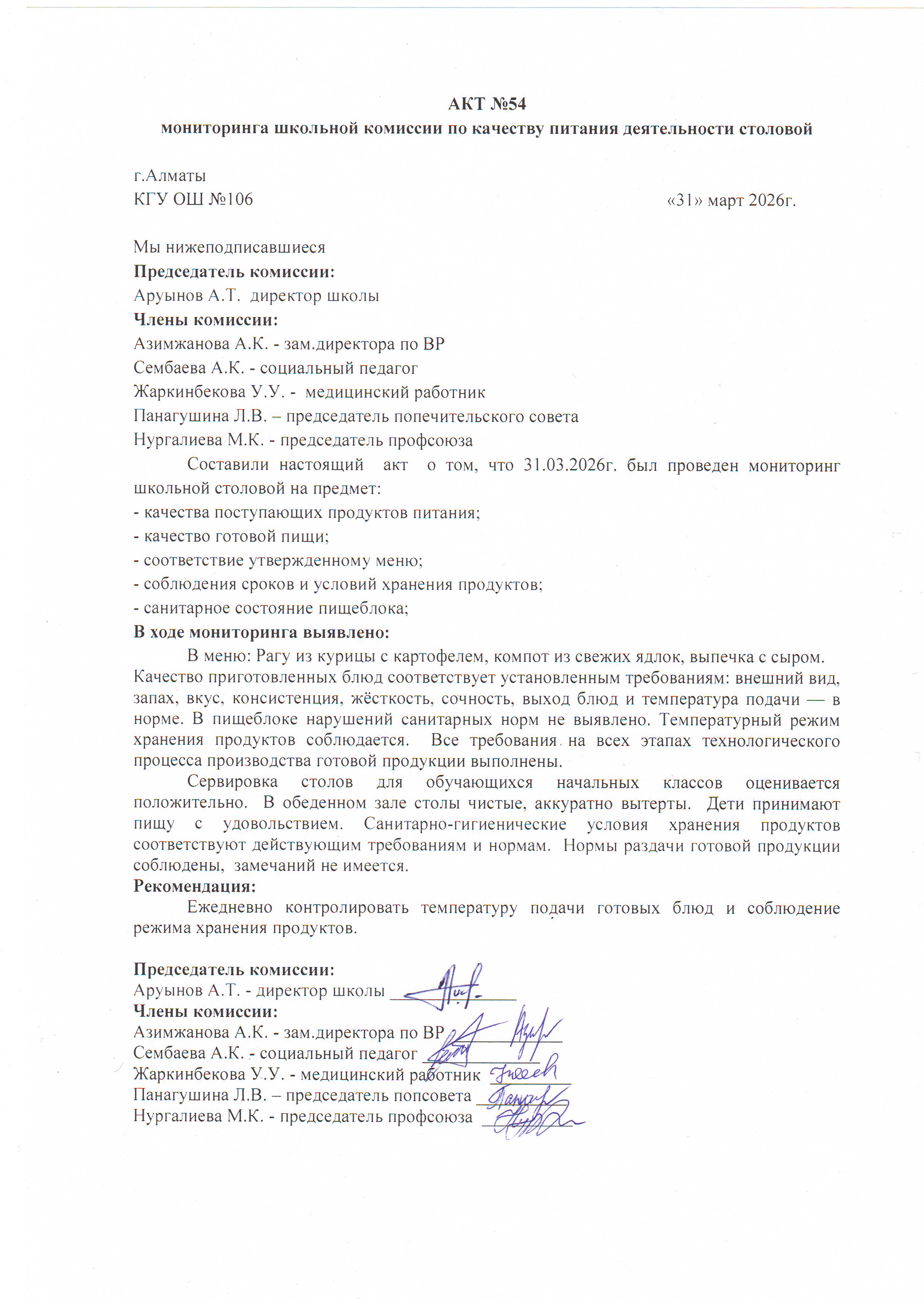 31 наурыз 2026 Асхана қызметіне тамақтану сапасы бойынша комиссиямен жүргізілген мониторинг актісі/АКТ проверки школьной столовой комиссии по монитерингу