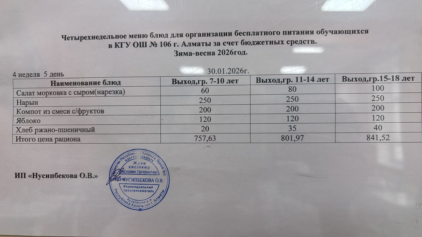 Бюджет қаражаты есебінен орта білім беру ұйымдарында білім алушылардың тегін тамақтануы/Четырехнедельное меню блюд для организации бесплатного питания обучающихся в организациях среднего образования за счет бюджетных средств зима 2025