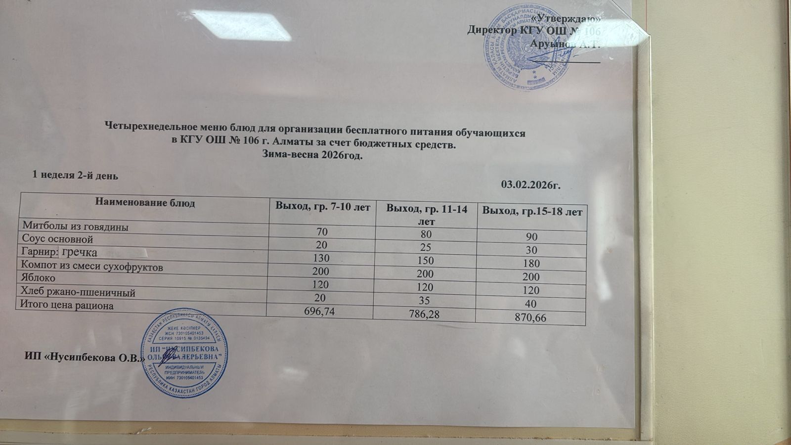 Бюджет қаражаты есебінен орта білім беру ұйымдарында білім алушылардың тегін тамақтануы/Четырехнедельное меню блюд для организации бесплатного питания обучающихся в организациях среднего образования за счет бюджетных средств зима 2025