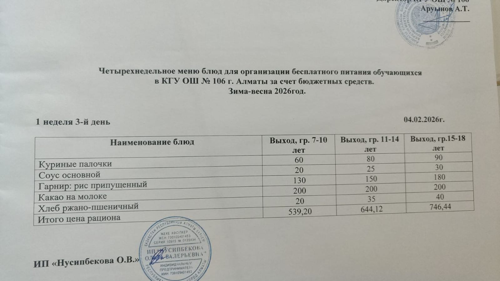 Бюджет қаражаты есебінен орта білім беру ұйымдарында білім алушылардың тегін тамақтануы/Четырехнедельное меню блюд для организации бесплатного питания обучающихся в организациях среднего образования за счет бюджетных средств зима 2025