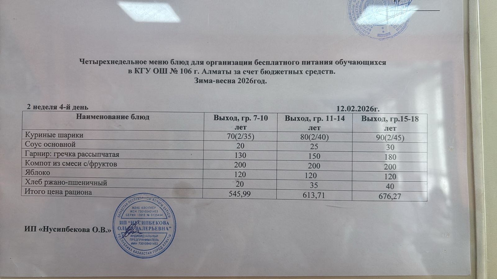 Бюджет қаражаты есебінен орта білім беру ұйымдарында білім алушылардың тегін тамақтануы/Четырехнедельное меню блюд для организации бесплатного питания обучающихся в организациях среднего образования за счет бюджетных средств зима 2025