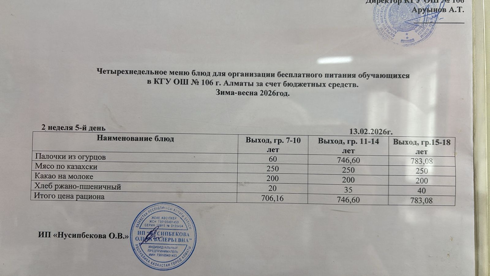 Бюджет қаражаты есебінен орта білім беру ұйымдарында білім алушылардың тегін тамақтануы/Четырехнедельное меню блюд для организации бесплатного питания обучающихся в организациях среднего образования за счет бюджетных средств зима 2025