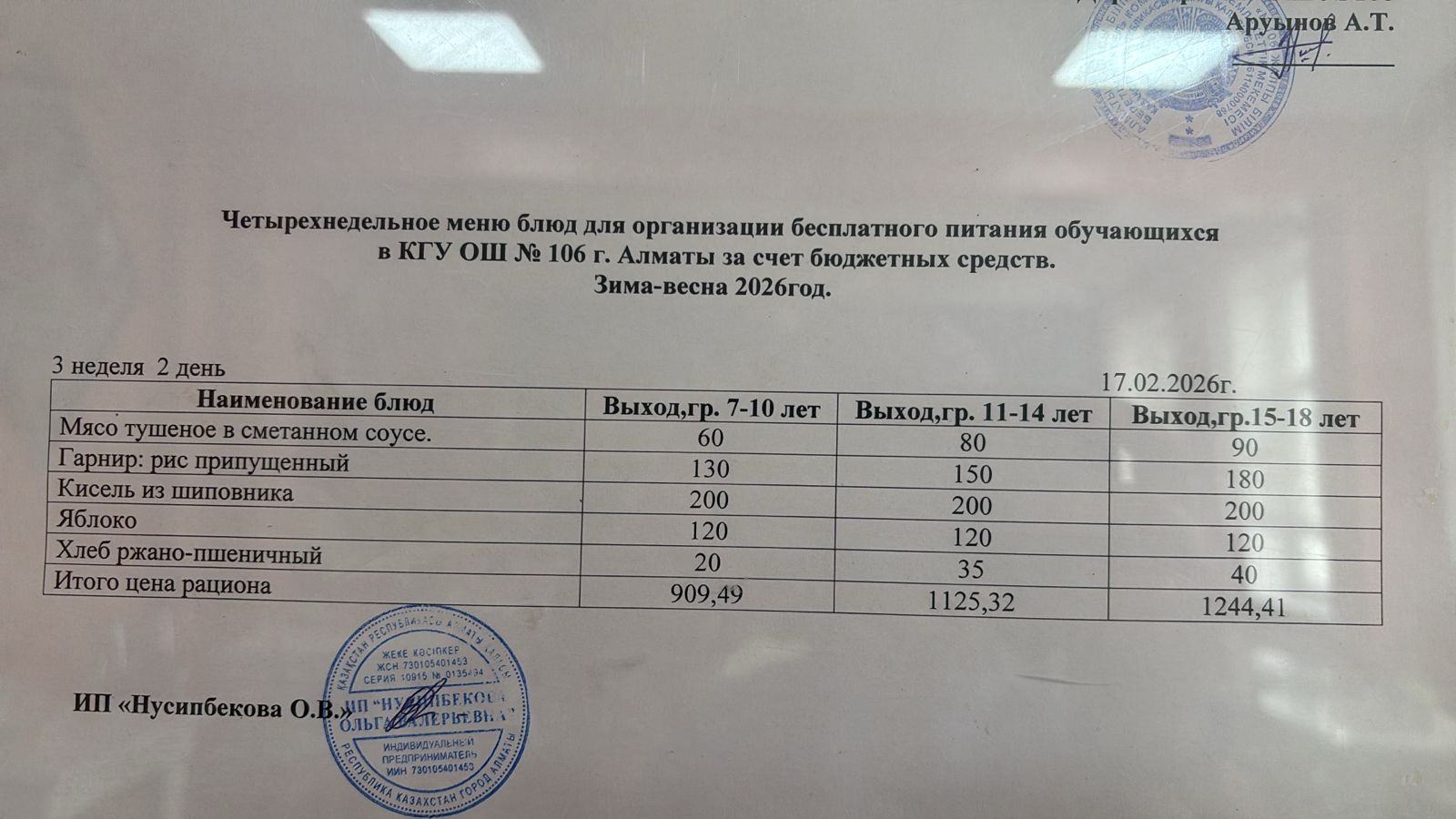Бюджет қаражаты есебінен орта білім беру ұйымдарында білім алушылардың тегін тамақтануы/Четырехнедельное меню блюд для организации бесплатного питания обучающихся в организациях среднего образования за счет бюджетных средств зима 2025