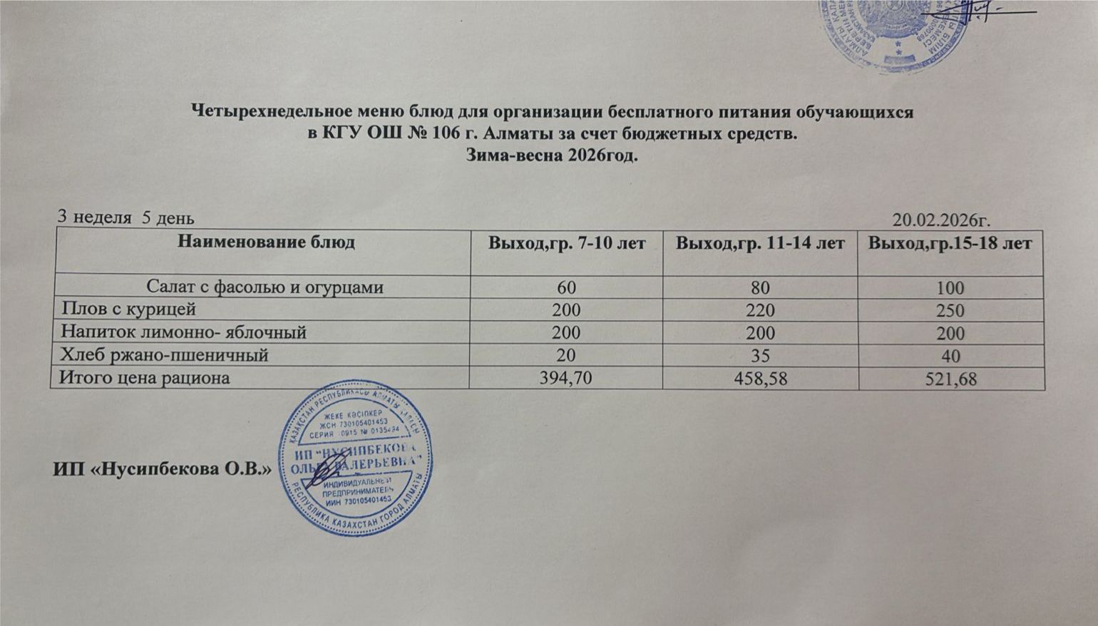 Бюджет қаражаты есебінен орта білім беру ұйымдарында білім алушылардың тегін тамақтануы/Четырехнедельное меню блюд для организации бесплатного питания обучающихся в организациях среднего образования за счет бюджетных средств зима 2025