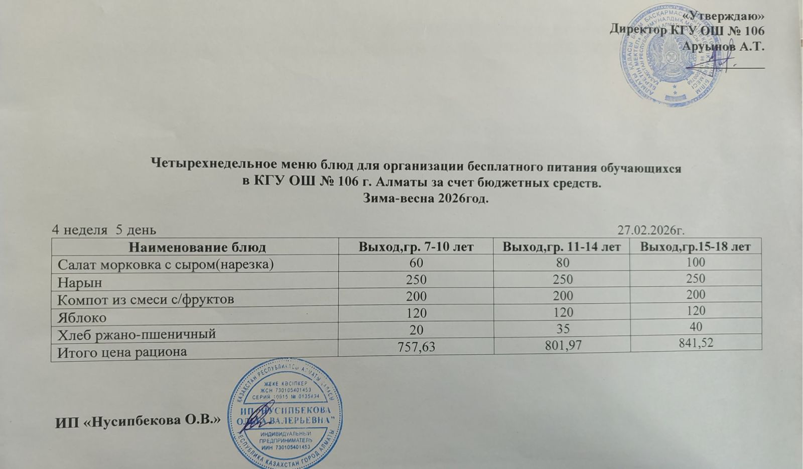 Бюджет қаражаты есебінен орта білім беру ұйымдарында білім алушылардың тегін тамақтануы/Четырехнедельное меню блюд для организации бесплатного питания обучающихся в организациях среднего образования за счет бюджетных средств зима 2025