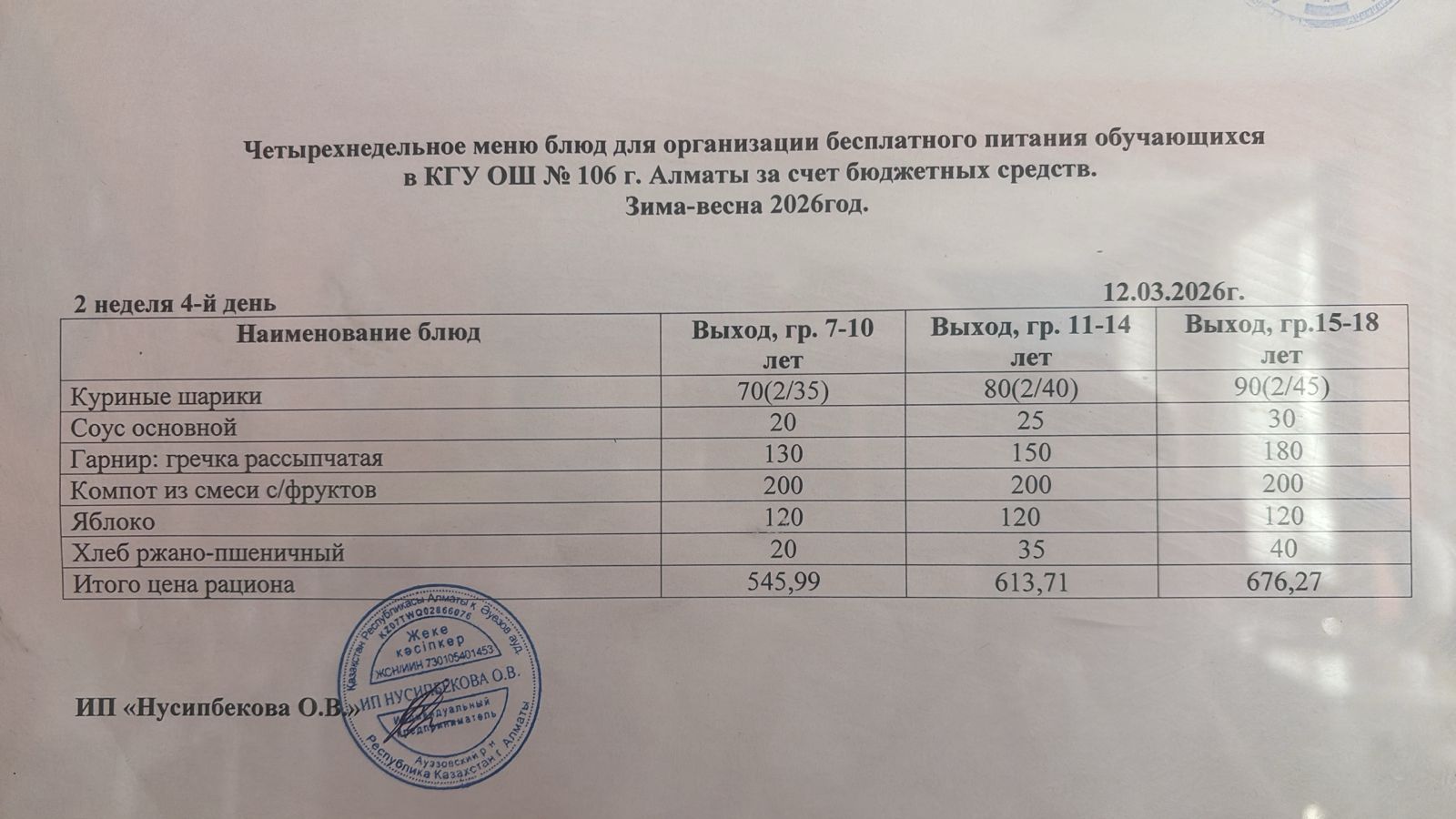 Бюджет қаражаты есебінен орта білім беру ұйымдарында білім алушылардың тегін тамақтануы/Четырехнедельное меню блюд для организации бесплатного питания обучающихся в организациях среднего образования за счет бюджетных средств зима 2025